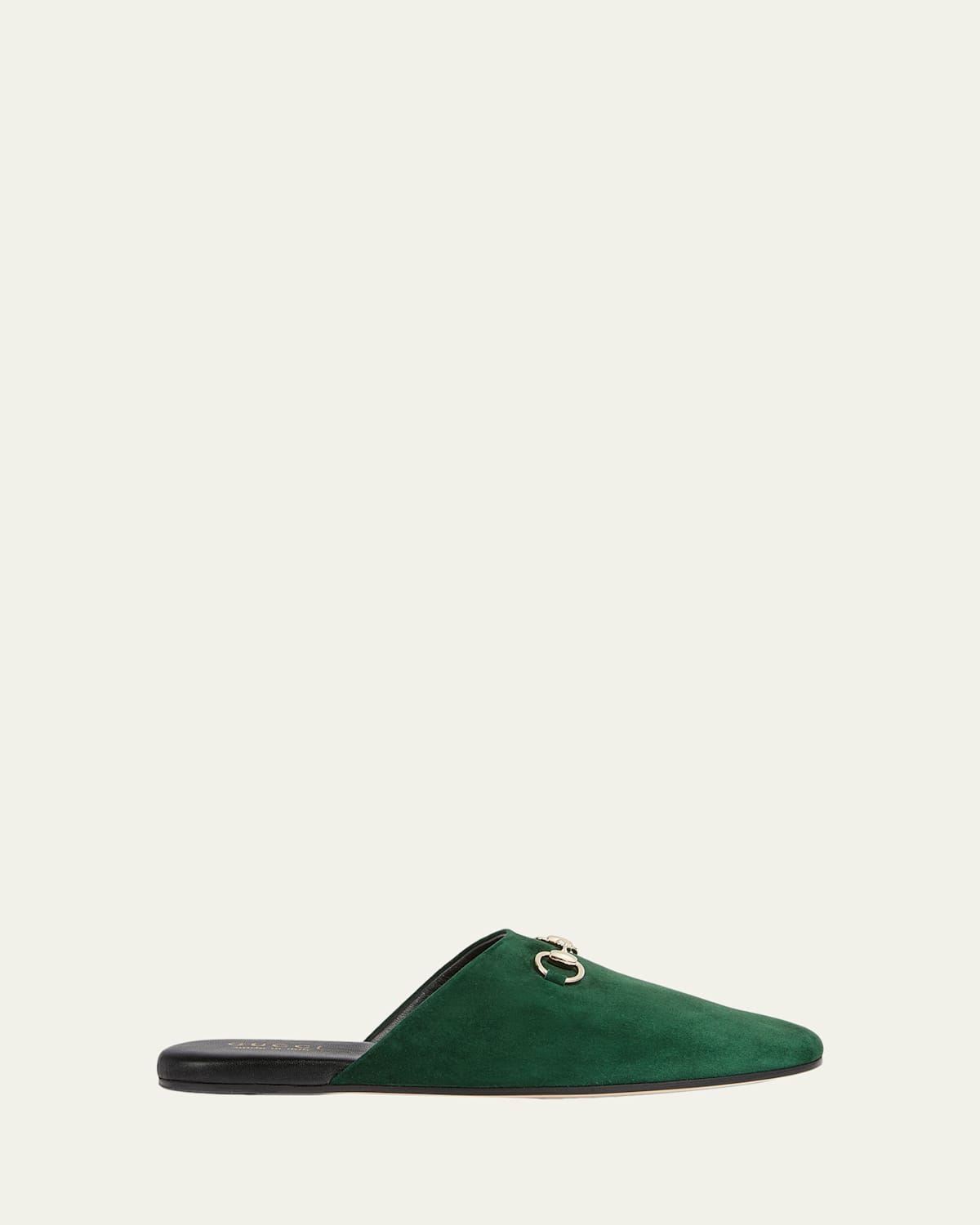 The "Annette" mules by Gucci are crafted from supple calf suede and adorned with the brand's iconic light goldtoned Horsebit hardware Flat heel Round toe Easy slide style Leather outsole Made in Italy
