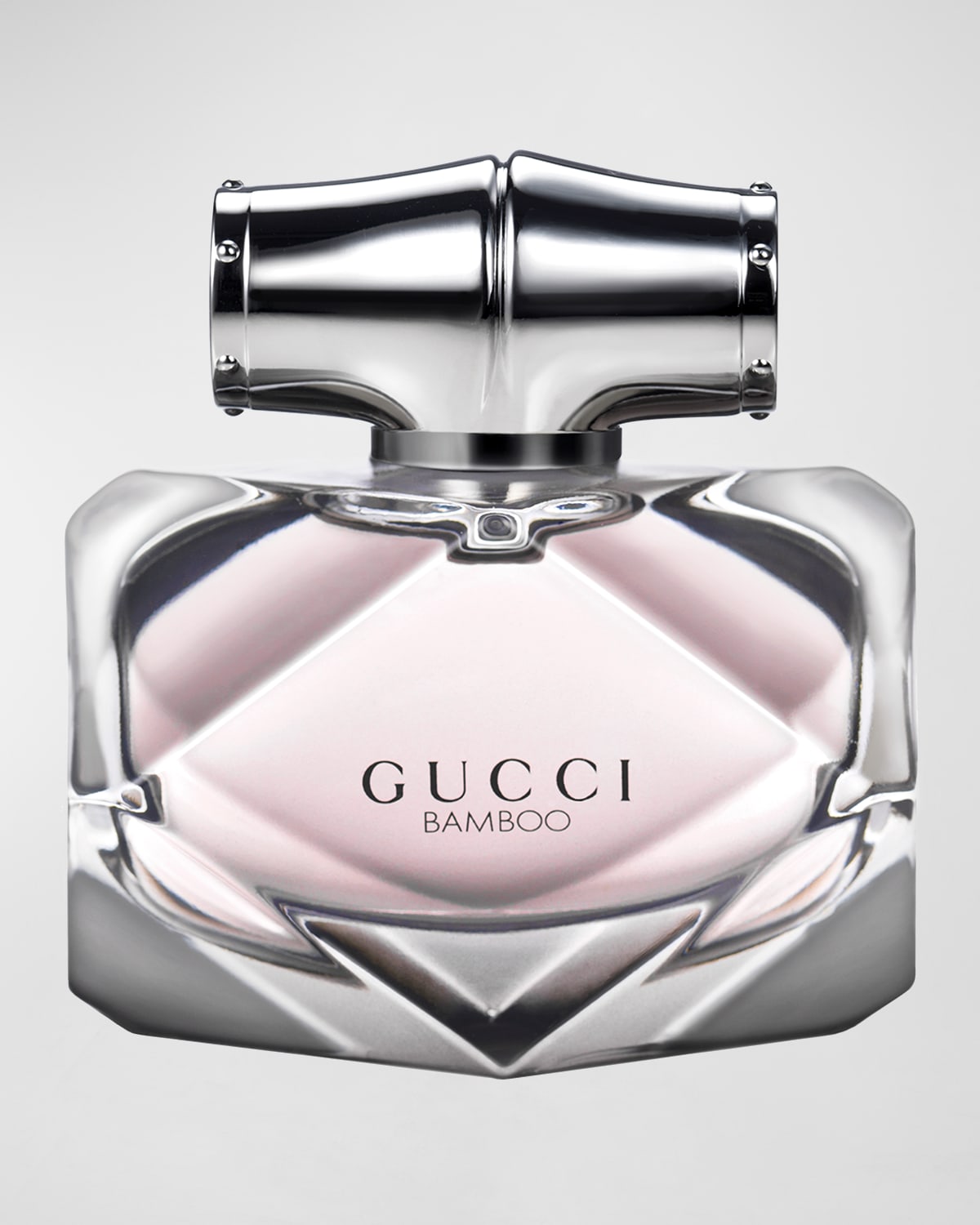 Captivating, convincing, the freespirited attitude characterizes Gucci's scent Bamboo. A woody and floral fragrance, Gucci Bamboo's eau de parfum is soft and intense at once, blooming with notes of exotic Casablanca Lily and Tahitian Vanilla. Sandalwood and Grey Amber balance the fragrance's femininity with a resonating woody contrast. The scent's composition is a statement on the woman who it's destined for: strong, graceful, and feminine. The shot of the bottle reflects the scent's nuances and inspiration, a beautifully composed frame in muted tones featuring fronds of bamboo leaves, and the bottle sitting on a vintage bamboo table. 75 mL/ 2.5 fl.