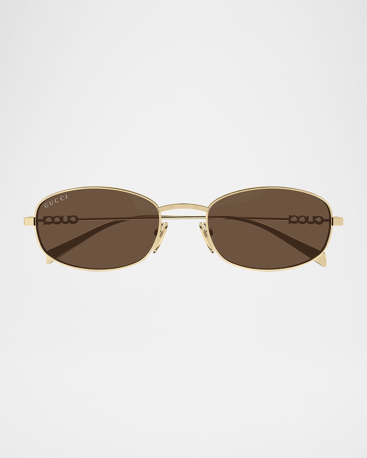 Featuring a logo insert detail at the hinges, the "Block" metal sunglasses by Gucci blend a statement silhouette with a contemporary touch. Lens/bridge/temple (in mm): 5418140 Oval frames Adjustable nose pads Thin, tapered arms Includes case and cleaning cloth 100% UVA/UVB protection Made in Italy