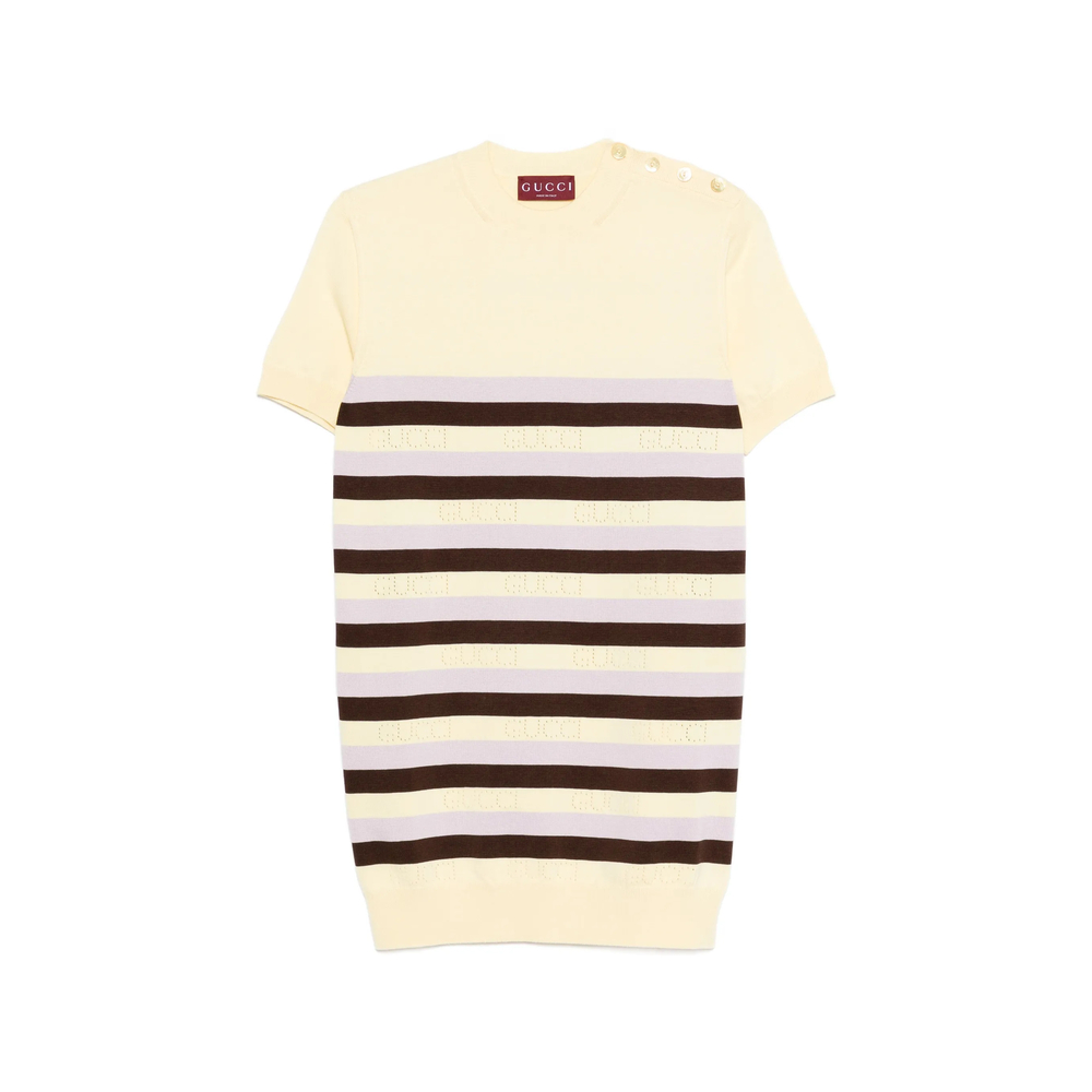 pale yellow striped buttoned shoulder short sleeves round neck logo detail