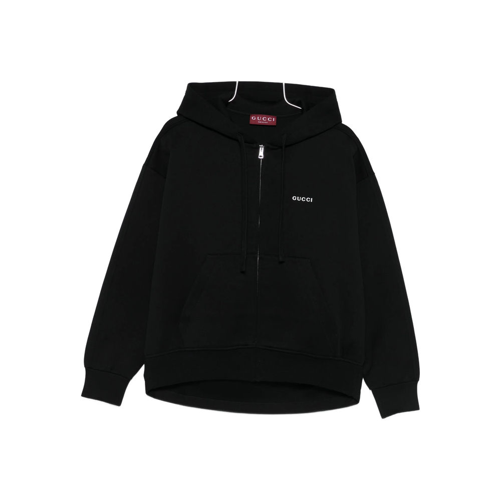 black cotton front zip fastening drawstring hood long sleeves side slit pockets