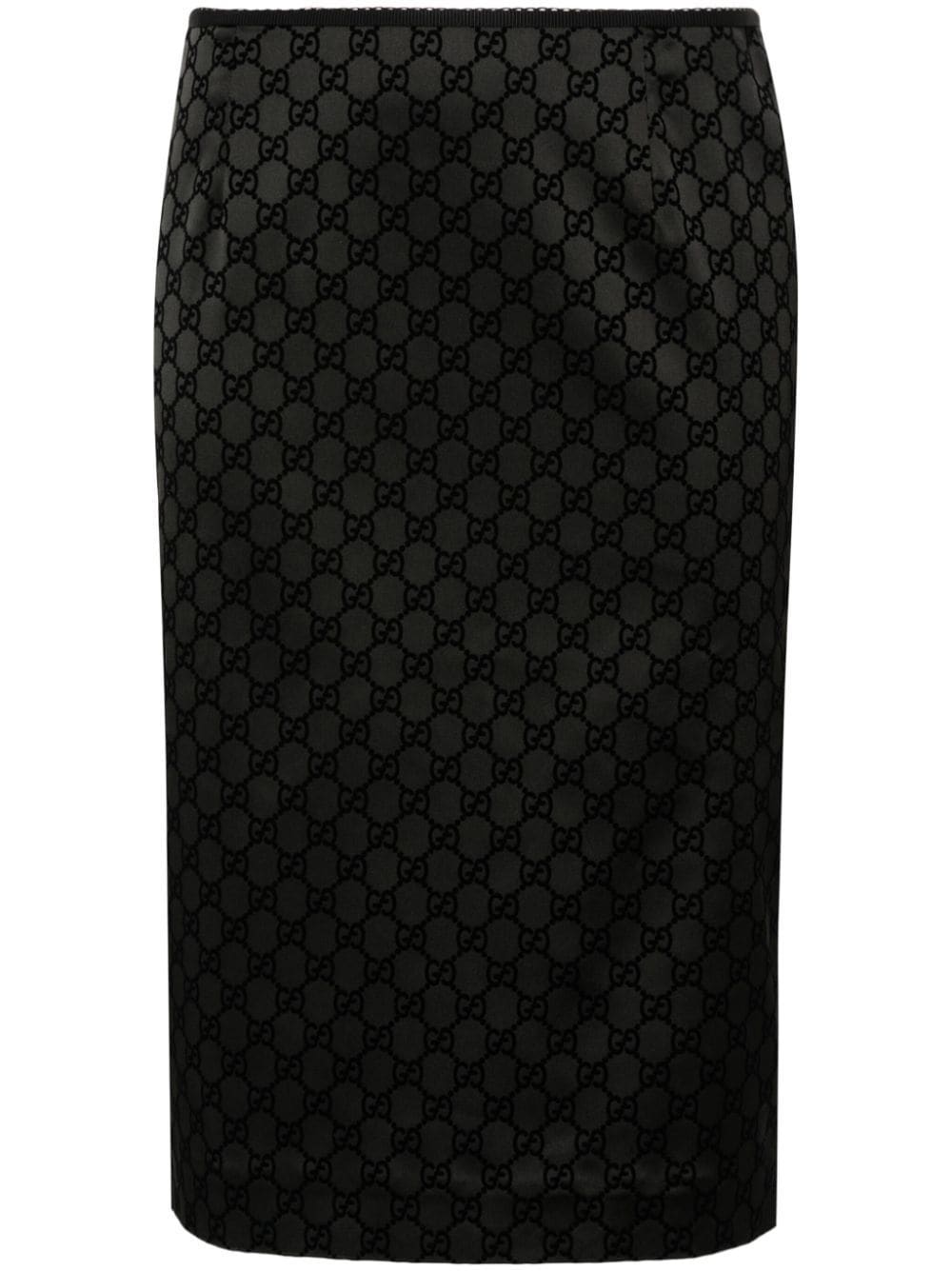 black duchess satin weave signature GG Supreme print concealed side zip fastening rear slit straight hem mid-length We've partnered with Good On You - an independent agency that rates how brands perform in relation to their impact on the planet, people and animals, with a multi-criteria rating simplified to a five points scale. In order to be awarded our conscious label, larger brands need to score a minimum of four out of five ('Good'), while smaller brands must score at least three out of five ('It's A Start'). This item comes from a brand rated three out of five ('It's A Start') by Good on You at the time it was added on FARFETCH. Please note, this is a brand-level rating and does not guarantee that this product is made with conscious materials. Learn more about what makes a product Conscious on our Conscious Criteria page