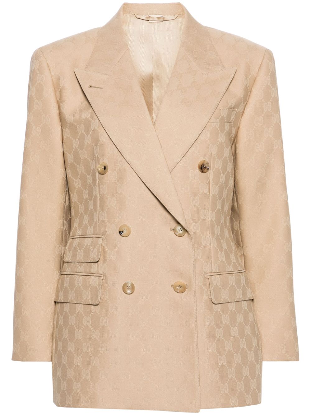 beige wool GG jacquard dart detailing peak lapels double-breasted button fastening logo-debossed buttons shoulder pads long sleeves buttoned cuffs chest welt pocket three side flap pockets American rear vent straight hem multiple internal slip pockets satin lining We've partnered with Good On You - an independent agency that rates how brands perform in relation to their impact on the planet, people and animals, with a multi-criteria rating simplified to a five points scale. In order to be awarded our conscious label, larger brands need to score a minimum of four out of five ('Good'), while smaller brands must score at least three out of five ('It's A Start'). This item comes from a brand rated three out of five ('It's A Start') by Good on You at the time it was added on FARFETCH. Please note, this is a brand-level rating and does not guarantee that this product is made with conscious materials. Learn more about what makes a product Conscious on our Conscious Criteria page