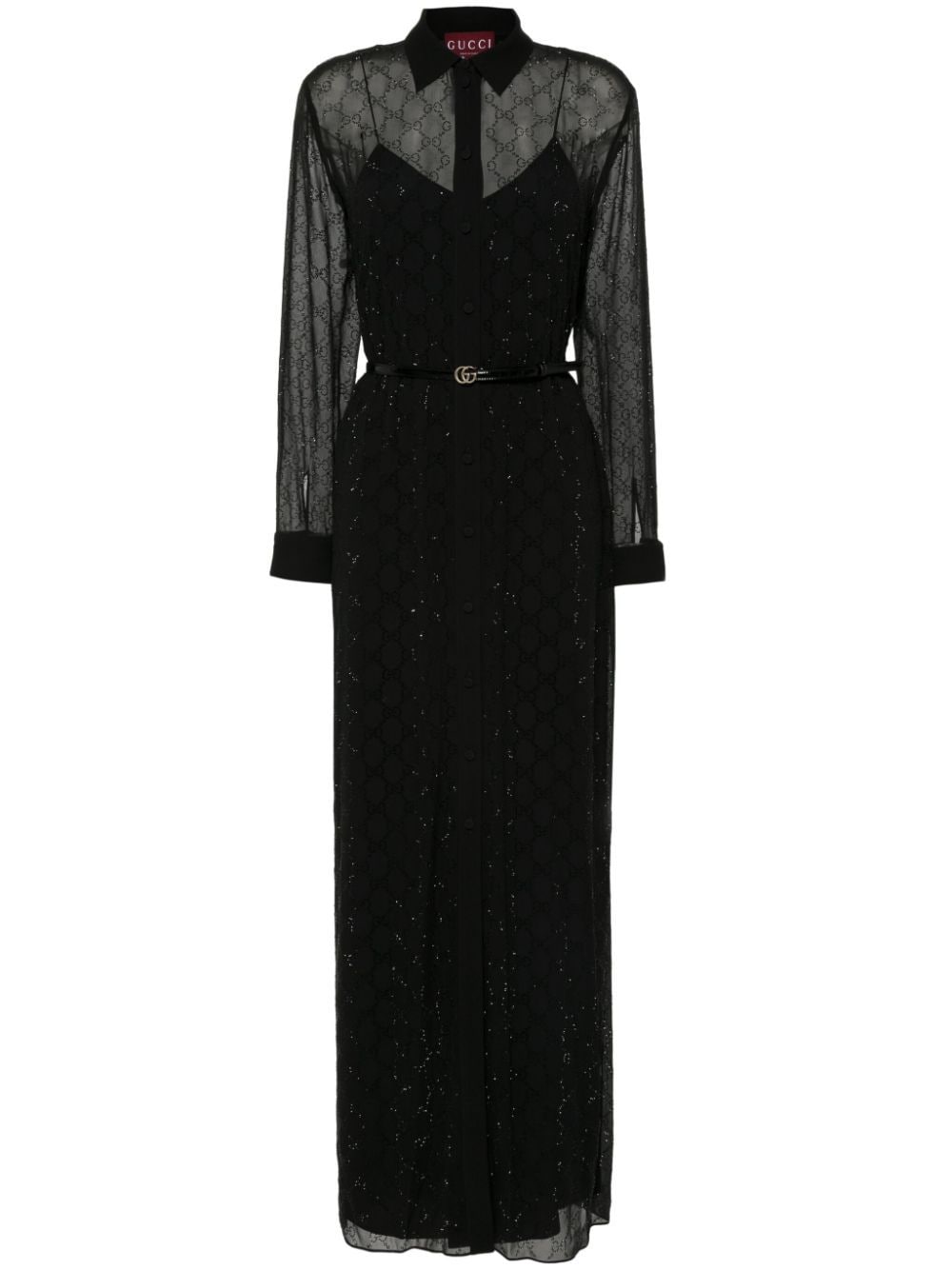 black silk semi-sheer construction crystal embellishment GG monogram spread collar long sleeves buttoned cuffs straight hem internal slip dress front button fastening We've partnered with Good On You - an independent agency that rates how brands perform in relation to their impact on the planet, people and animals, with a multi-criteria rating simplified to a five points scale. In order to be awarded our conscious label, larger brands need to score a minimum of four out of five ('Good'), while smaller brands must score at least three out of five ('It's A Start'). This item comes from a brand rated three out of five ('It's A Start') by Good on You at the time it was added on FARFETCH. Please note, this is a brand-level rating and does not guarantee that this product is made with conscious materials. Learn more about what makes a product Conscious on our Conscious Criteria page