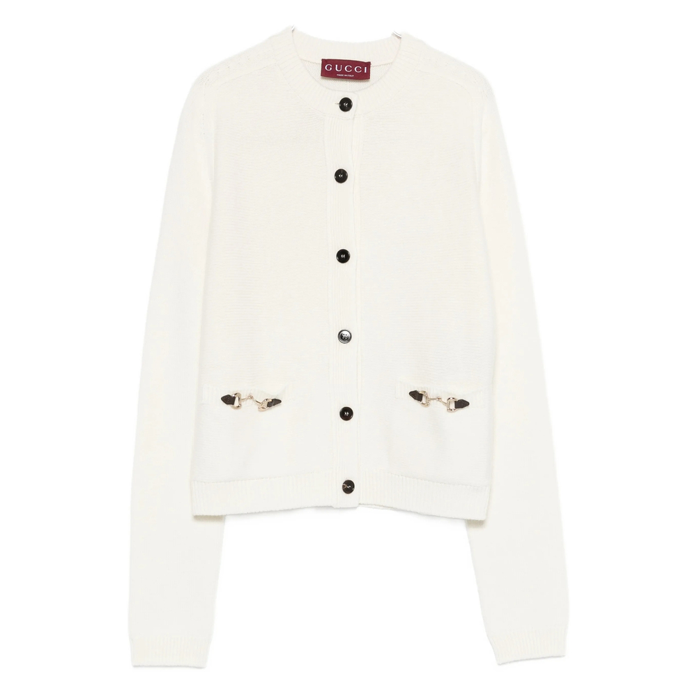 white Horsebit detail crew neck front button fastening long sleeves two pockets