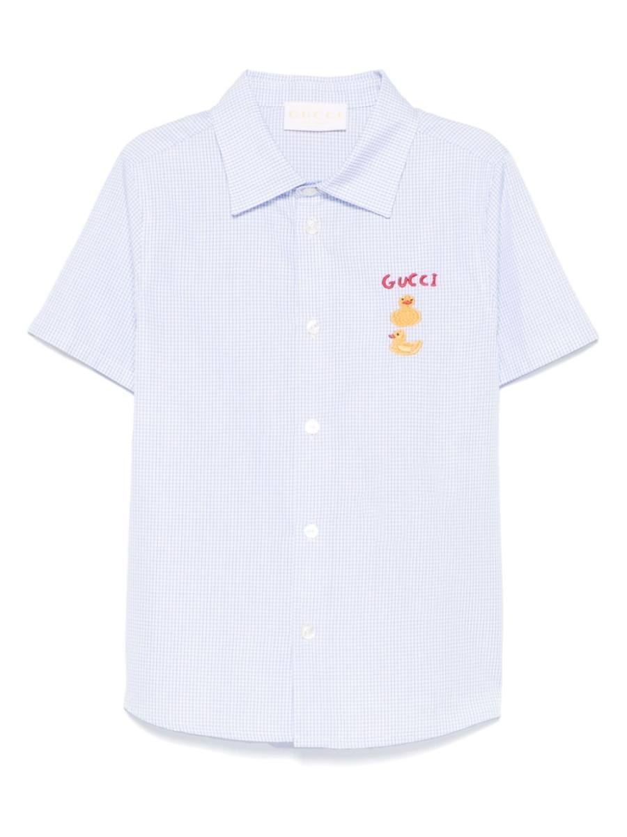 light blue front button fastening embroidered logo at the chest grid pattern spread collar