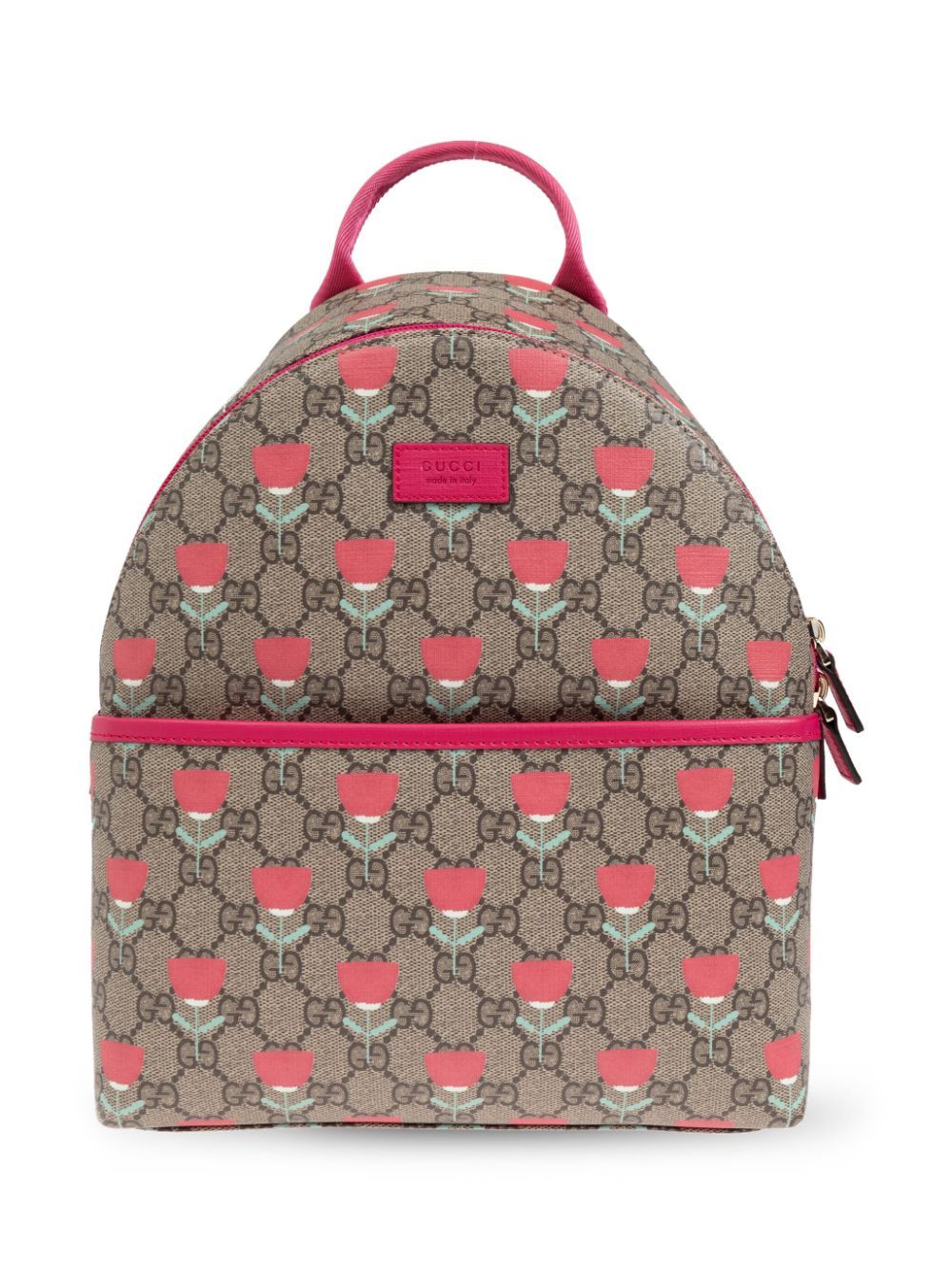 taupe grey/raspberry pink calf leather signature Double G logo logo patch to the front all-over floral print single top handle two adjustable shoulder straps top zip fastening main compartment front zip-fastening pocket