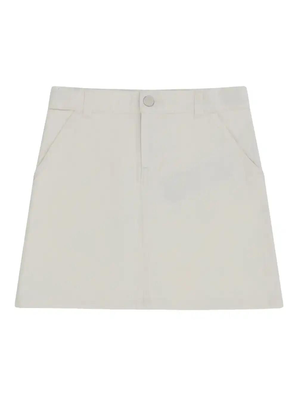 white concealed fly and button fastening belt loops two diagonal pockets to the sides two rear patch pockets