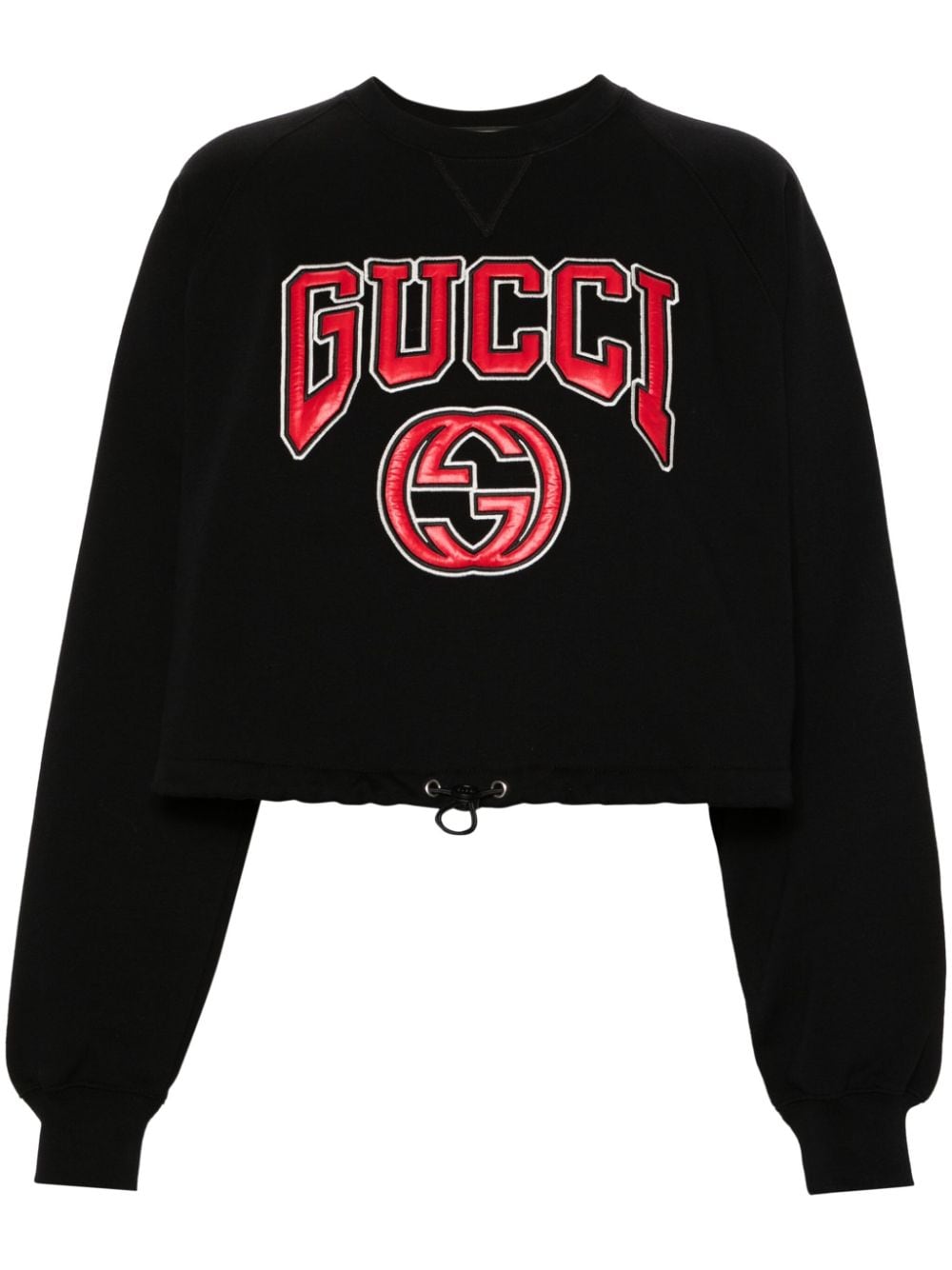 black/red cotton jersey fleece appliqué logo crew neck long raglan sleeves ribbed cuffs drawstring hem cropped