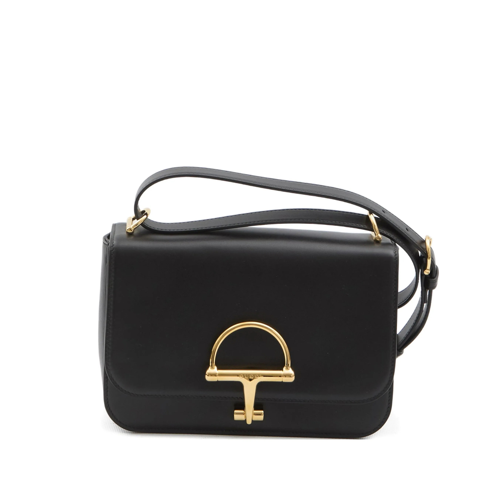 black leather adjustable shoulder strap foldover top signature Horsebit detail partitioned compartment zip pocket gold-tone hardware This piece comes complete with a protective dust bag.