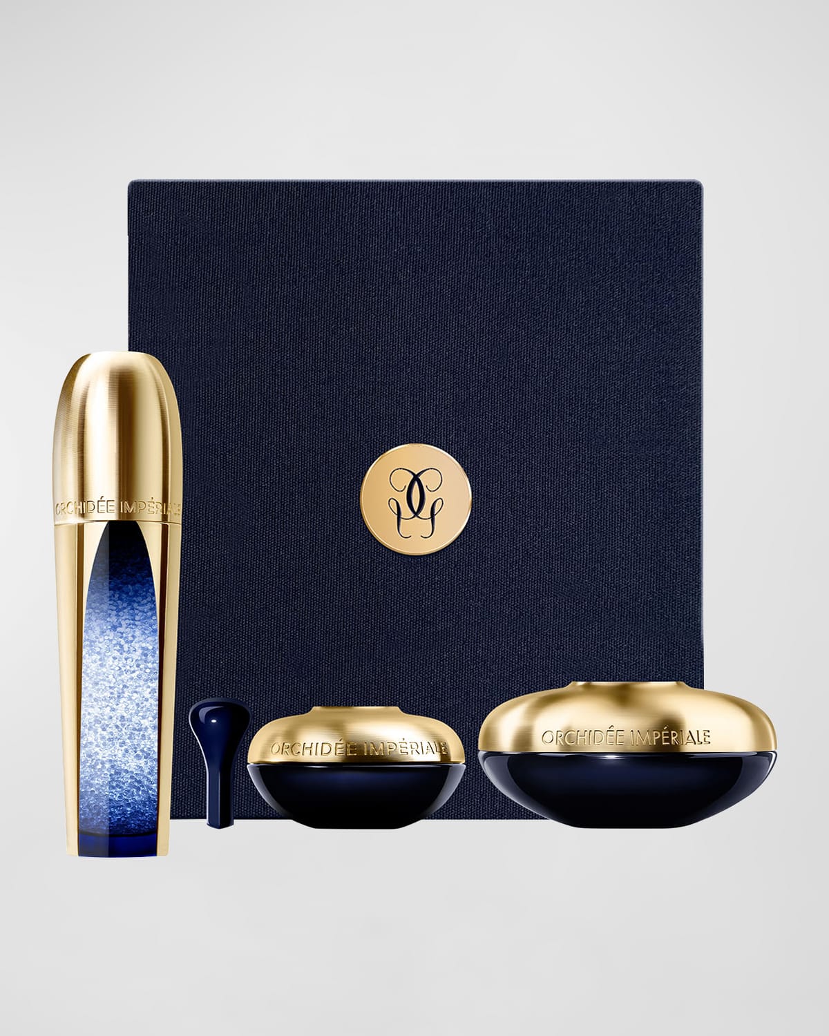 The Cream, 50 mL MicroLift Serum, 30 mL The Molecular Concentrate Eye Cream, 20 mL What It Does MicroLift Concentrate Serum: The ultimate agedefying tightening serum formulated with microsculptors and microfillers, harnesses the longevity powers of orchids to improve the visible signs of aging and provide a longlasting lifting effect to the skin. Cream: This luxurious cream works to reduce all visible signs of aging: wrinkles, fine lines, loss of firmness, density, and elasticity for the ultimate skin rejuvenation now made with new orchidduo technology. Molecular Eye Cream Concentrate: A highly concentrated and rejuvenating eye cream to visibly lift the eye area and reduce the appearance of fine lines, wrinkles, and expression lines. How To Use Apply the Micro Lift Concentrate Serum morning and evening before the Cream. Apply the Cream using small circular movements all over the face. Complete the routine by applying the Molecular Eye Cream Concentrate using your fingertips take a small amount of product and apply to the eye contour. Key Ingredients The orchid, a rare and precious raw ingredient, is the very essence of the exceptional complete care range Orchidée Impériale. A genuine longevity prodigy, the orchid is the most developed species in the plant kingdom. Convinced of its outstanding potential, Guerlain has set up its firstever research center ever to be devoted to a single ingredient: the Orchidarium. Orchidee Imperiale Cell Respiration Technology: Regulates cellular respiration and combats hypoxia or oxygen deficiency, a phenomenon that increases with age. The cells can breathe again and maximize energy production which boosts cell regeneration and targets all visible signs of aging.