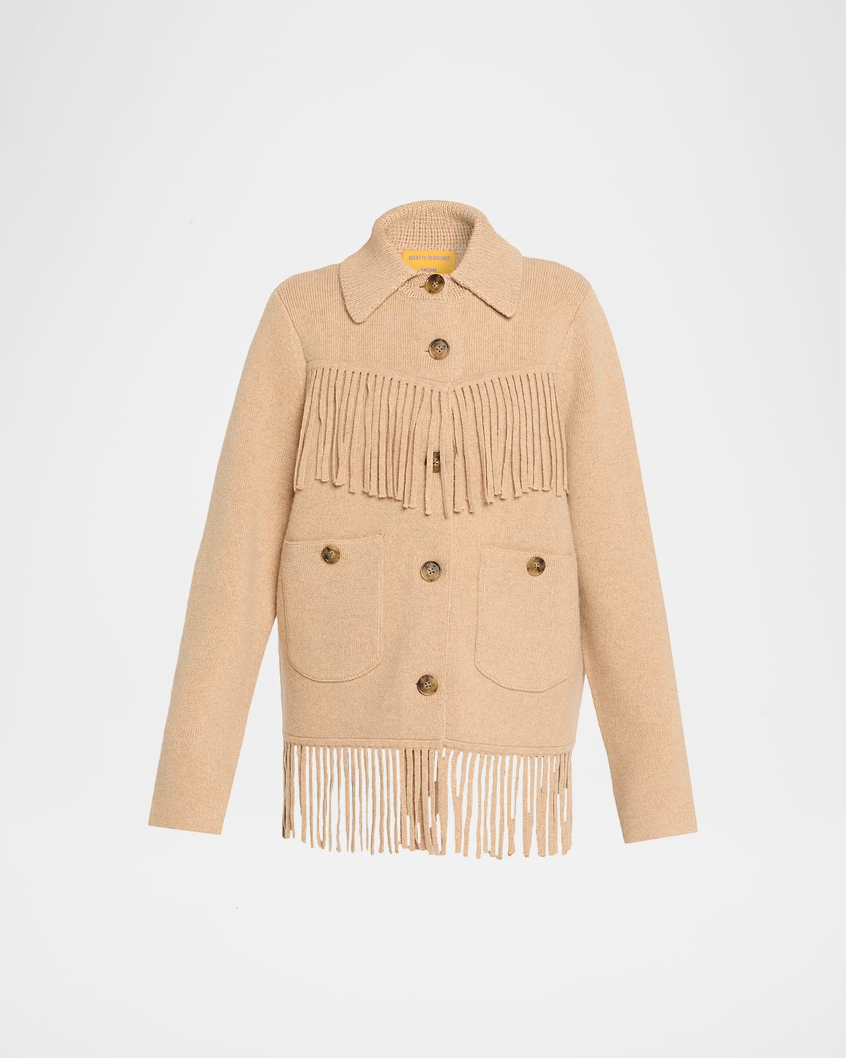 Designed from a luxurious blend of heavyweight mercerized wool and cashmere, this Westernstyle jacket by Guest in Residence is enhanced with knitted movementrich fringe 5GG Spread collar; button front Long sleeves with topstitched elbow patches Two front patch pockets with button closures Yoked front and back Relaxed fit Midlength Wool/cashmere Imported