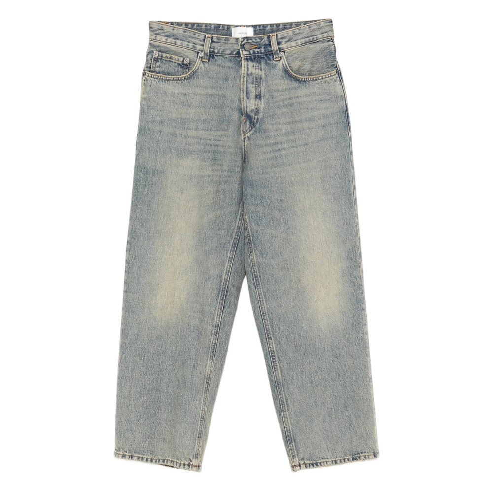 light blue button fastening belt loops five pockets tonal stitching