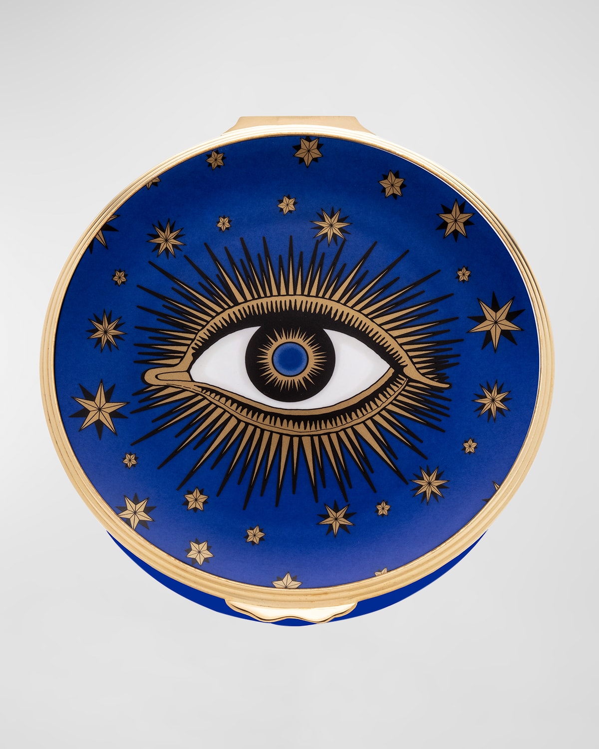 An elegant and longlasting gift that features the universal symbol of protection: the Evil Eye. Enameled box handcrafted of goldplated copper Approx. 3.3"Dia x 1.2"D Hand wash, wipe clean Imported