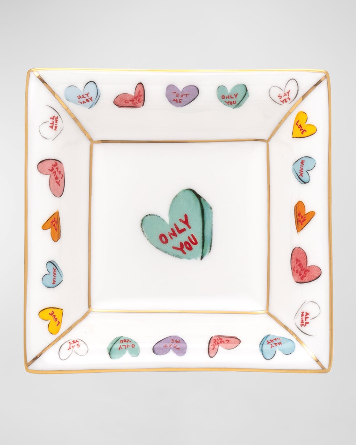 This precious tray is ideal on a vanity or desk; or as an accent piece anywhere. Features whimsical love heart candies with a golden trim Handcrafted of goldplated bone china Approx. 4.8"Sq. x 1.4"T Item Weight (Lbs.): 0.6 Wipe clean Imported
