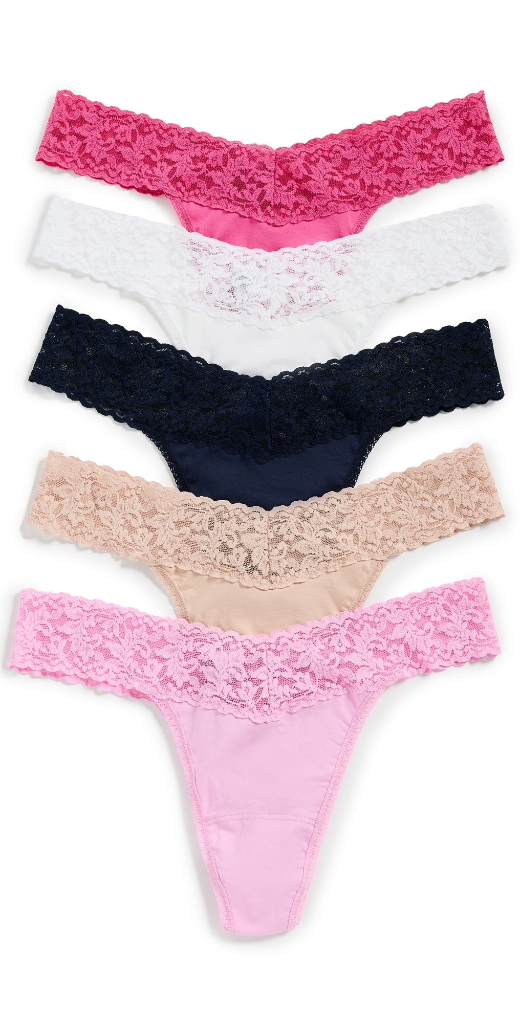 Stretch lace. 5 pack. Thong panty. Shell: 96% cotton/4% spandex. Hand wash. Imported, Dominican Republic.