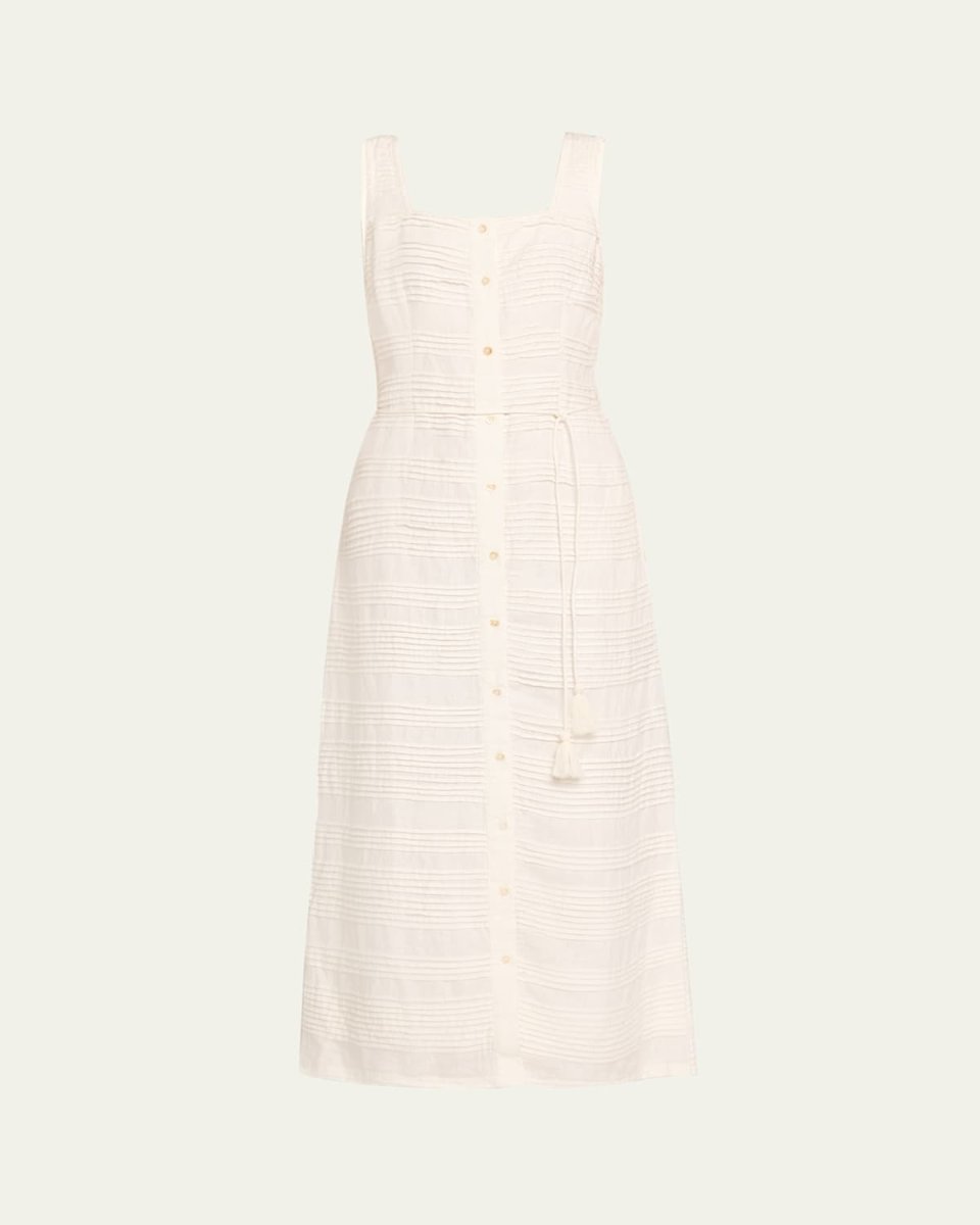 Hannah Artwear "Paloma" sundress featuring pintucks and a removable tassel waist tie Approx. 51"L from shoulder to hem Square neckline Wide straps Fabriccovered button front Side slip pockets Hem falls below the knee Aline silhouette Linen Unlined Hand wash Imported