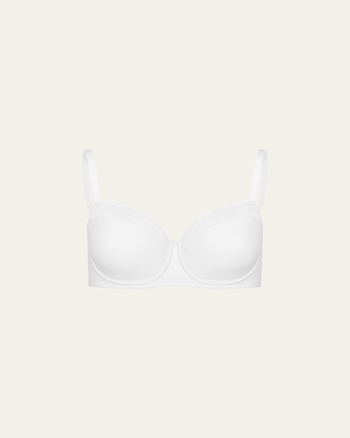 Hanro stretchcotton spacer bra trimmed in scalloped lace along upper cup edge. Contour/Tshirt underwire cups with light spacer foam padding for a round, even shape. Light and breathable spacer foam padding molds to bust for a natural shape. Tall triangle center with slightly arched underside for tummy comfort. Sides and back have sewnon elastic edges for a secure fit. Adjustable shoulder straps with silvertone hardware. Ideal for larger cup sizes and soft tissue. Coated metal hookandeye back closure. Cotton/spandex. Made in Hungary.