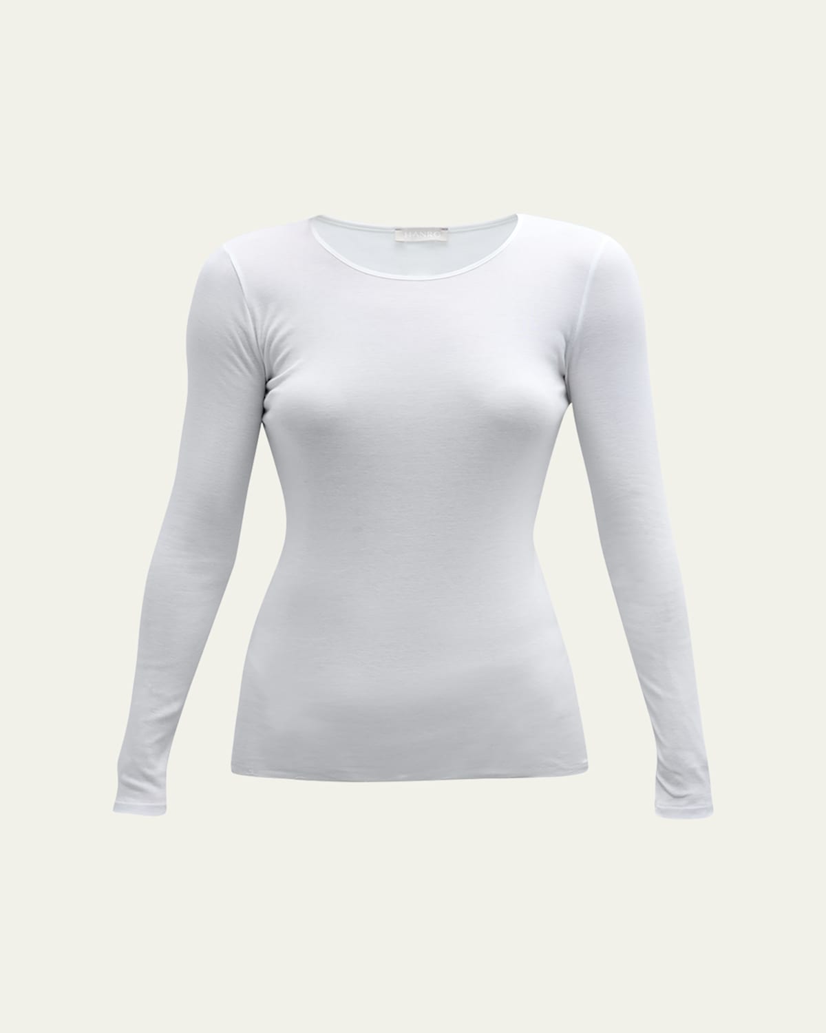 Hanro seamless knit top. Can be worn on its own as a casual, everyday top or for layering. Scoop neckline. Long sleeves. Styled with flat satin trims and a hemless bottom. Seamless sides for the perfect fit. Fitted silhouette. Pullover style. Mercerized cotton. Made in Hungary.