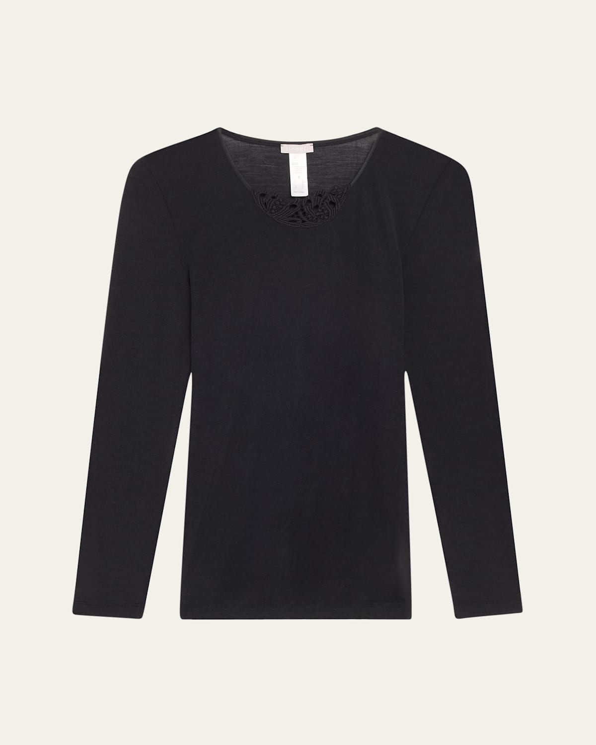 Hanro shirt in woolen silk with embroidery in Merino wool STANDARD 100 by OEKOTEX® - This item has been laboratory tested to meet 100 control parameters and is free of harmful substances Approx. 23"L from shoulders to hem Scoop neckline Long sleeves Slim fit Pullover style Wool/silk Made in Portugal