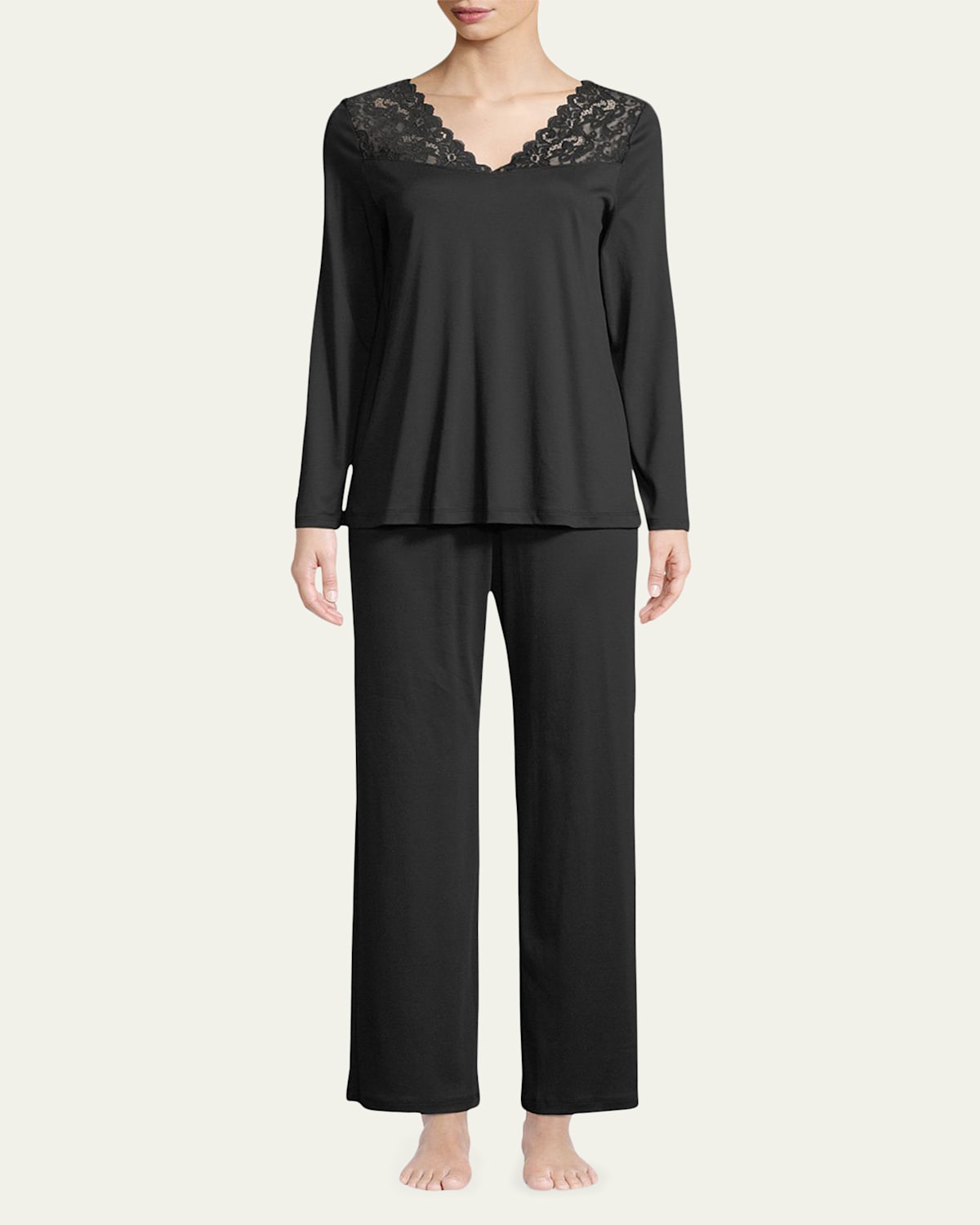Hanro twopiece pajama set with luxurious lace trim V neckline Long sleeves Relaxed silhouette Includes matching pants Elasticized waistband Full length Straight legs Pullon style Mercerized cotton Hand wash Imported