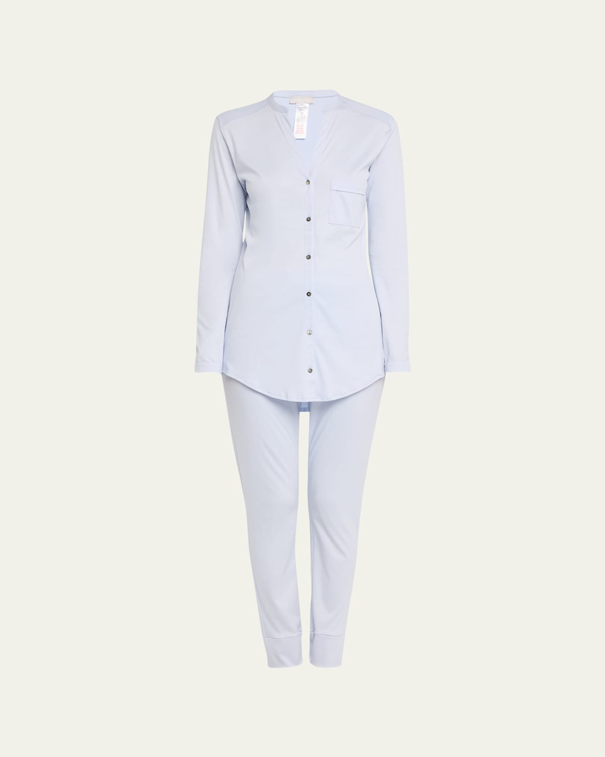 Hanro "Pure Essence" boyfriendstyle pajama set. Split V neckline; button front. Long sleeves with banded cuffs. Yoked back shoulders; box pleat. Shirttail hem. Includes matching pants; elasticized waist. Straight leg slightly taper at ankle. Pullon style. Mercerized cotton. Imported.
