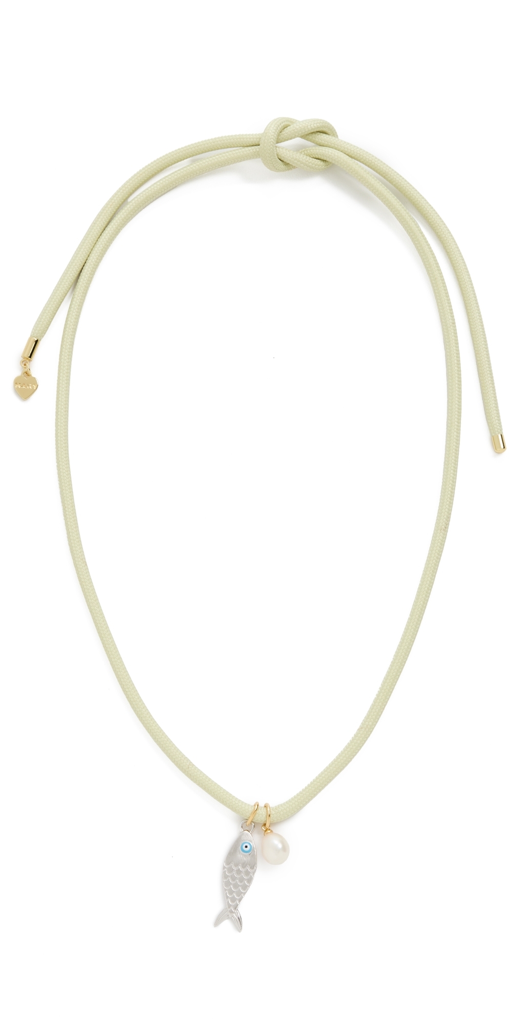 Silver-tone metal fish pendant. Freshwater cultured pearls. Self-tie closure. Imported, Thailand. Measurements: Length: 33.75in / 86.0cm