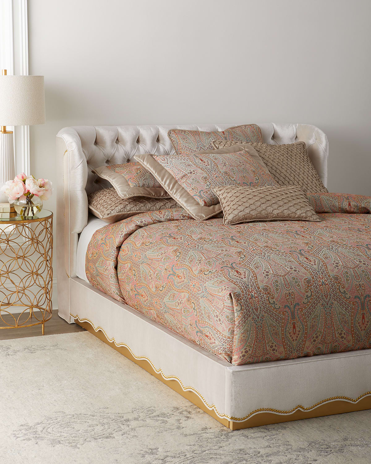 This velvetupholstered bed frame features a scalloped wing headboard with a tufted interior, scalloped rails, a plinth gold base, and finished with a nailhead trim. Handcrafted of engineered hardwood and polyester Overall, approx. 67"W x 86"D x 42.25"T Space for mattress/box spring: 61.75"W x 81"D x 12.5"T Rail height: 10.25" Slat height: 7.5" Footboard height: 10.25" Assembly required; includes hardware Finished back Weight, 140.0 lbs Made in USA Boxed weight, approximately 209.0 lbs