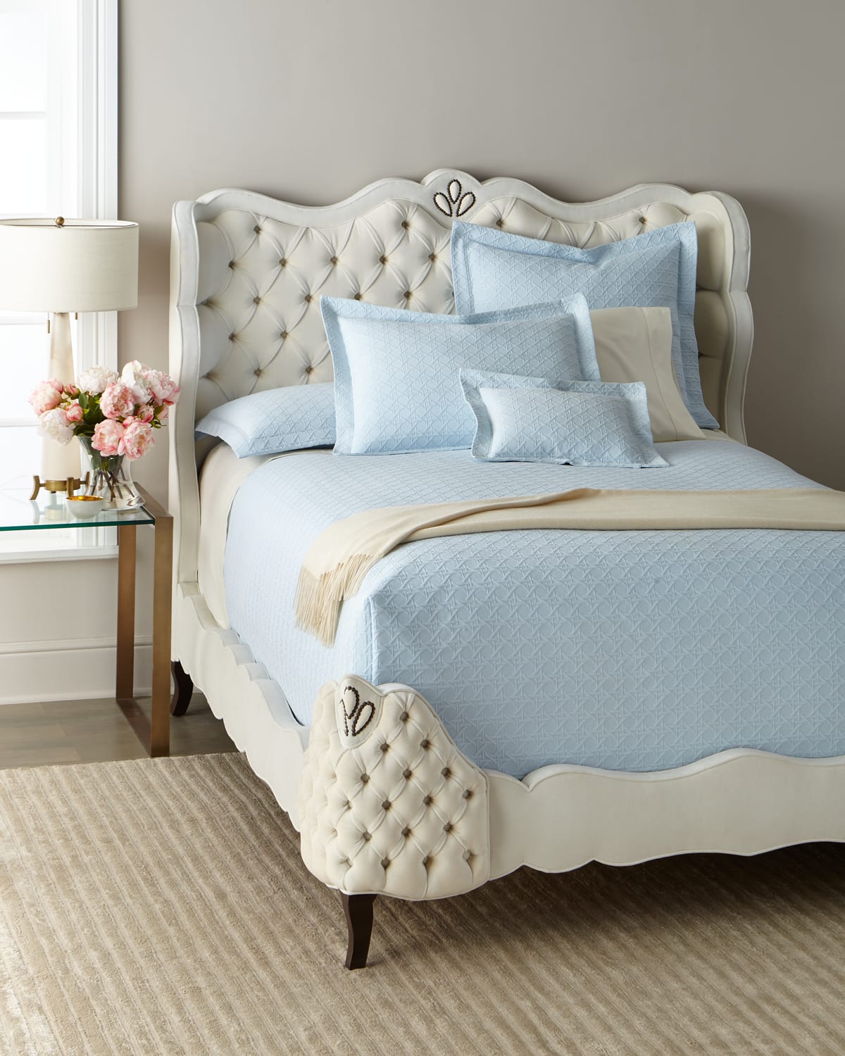 EXCLUSIVELY OURS. Handcrafted bed with tacked detail. Hardwood frame. Frame: acrylic/polypropyiene/viscose/polyester. Dark walnut legs. Brown nail head trim. Tufted headboard and footboard. Dacron, upholstery foam, wood glue, upholstery glue, staples, screws, typar. 89"W x 83.5"D x 59.3"T. Assembly required; hardware included. Weight: 228 lbs. Made in the USA. Boxed weight, approximately 248 lbs.