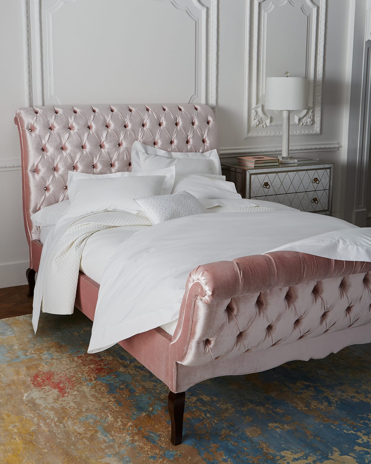 EXCLUSIVELY OURS. Handcrafted bed. Hardwood frame with darkwalnut finish. Polyester velvet upholstery with glassbutton tufting. Assembly required. 81"W x 110"L x 55"T. California king bed, 74"W x 114"L x 55"T. Boxed weight, approximately 318 lbs. Made in the USA of imported materials. Boxed weight, approximately 324 lbs.