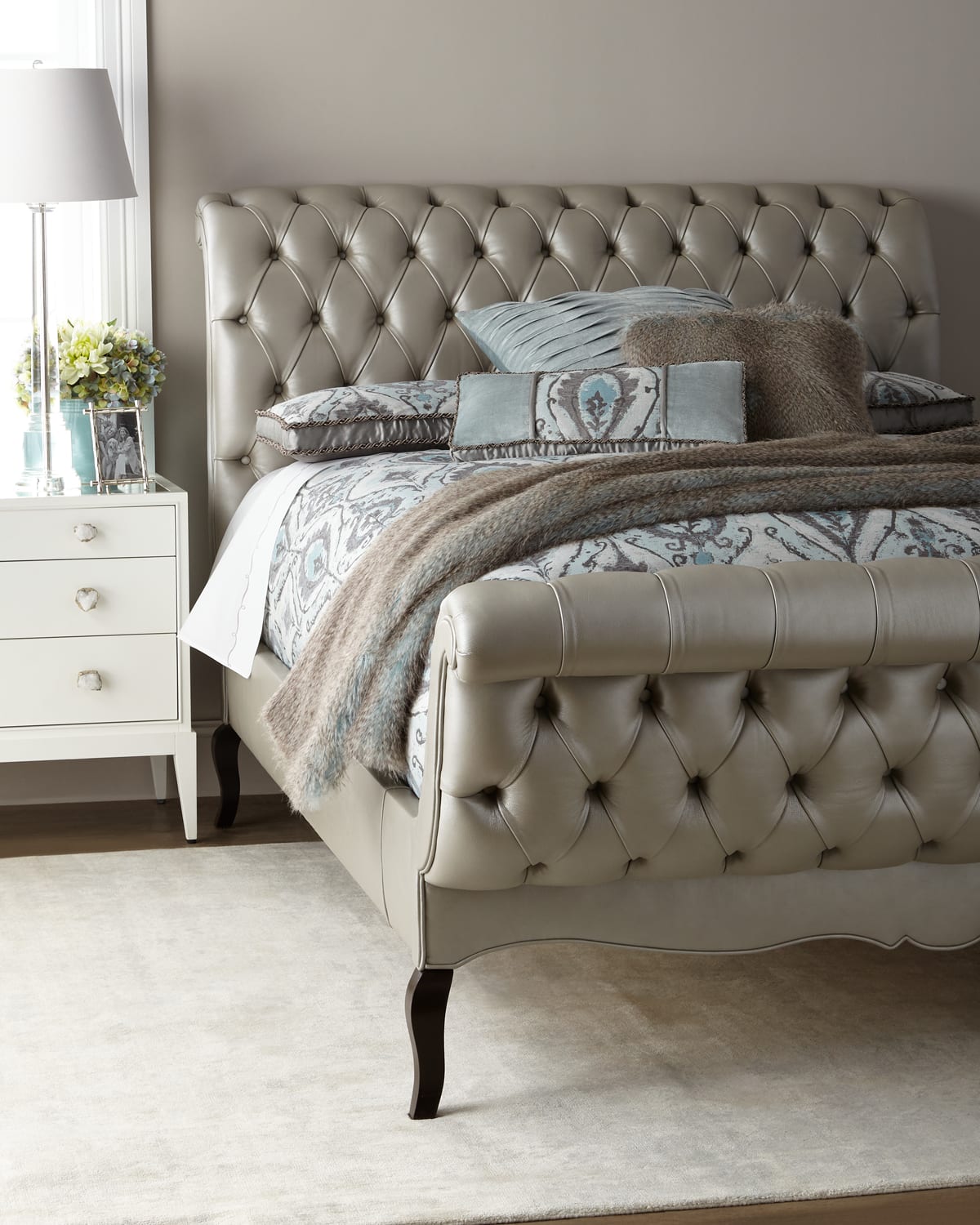 Handcrafted leather tufted bed. 65"W x 110"D x 55"T. Hardwood frame. Hardware included. Imported. Boxed weight, approximately 281 lbs.