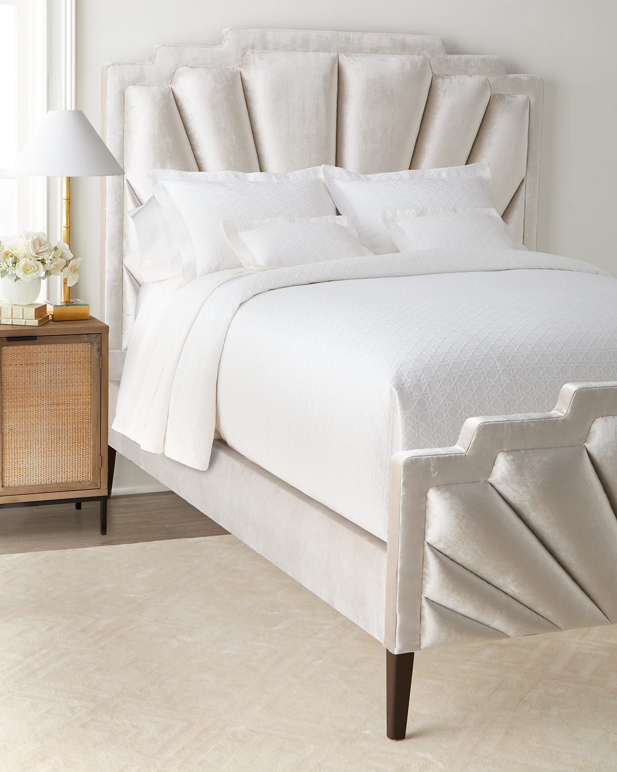 Art Decoinspired queen bed features velvet upholstery and dark walnut trim on the legs Handcrafted of engineered hardwood and polyester Rail height: 16.5" Footboard height: 30.5" Rail height: 16.5" Mattress height: 13.5" Item weight, 152.0lbs Finished back Assembly required; hanging hardware included Made in USA Boxed weight, approximately 211.0lbs