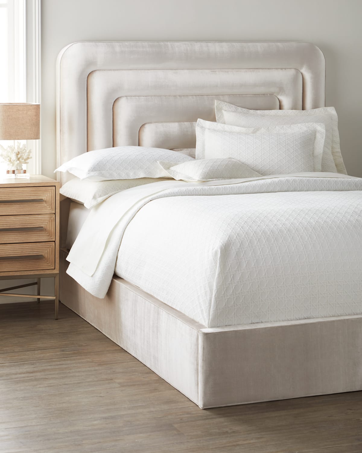 The Gillian Bed features a geometric channeled headboard and no legs Handcrafted of hardwood solids Upholstery, polyester Overall, approx. 65.75"W x 87.25"D x 57.25"T Inner, approx. 62"W x 81.5"D Rail height: 12" Slat height: 11.25" Space for box spring/mattress: 12.75" Assembly required; includes hardware Finished back Weight, 168.0 lbs Made in USA Boxed weight, approximately 238.0 lbs