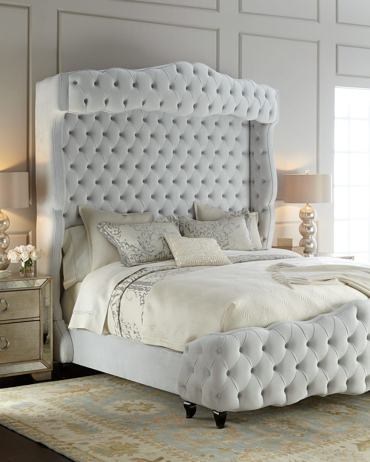 EXCLUSIVELY OURS. Handcrafted bed. Hardwood frame. Polyester upholstery. Assembly required. 87"W x 93"L x 92"T. Made in the USA of imported material. Boxed weight, approximately 614 lbs.