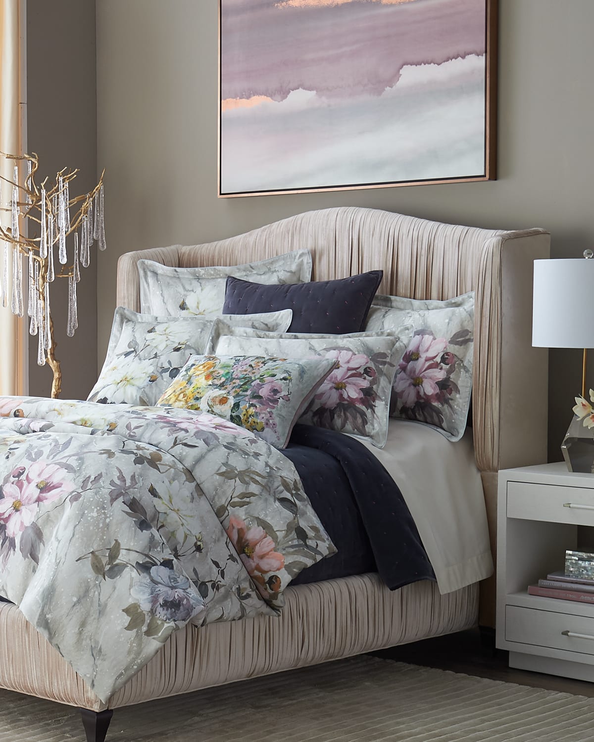 Handcrafted wing back style bed. Hardwood frame. Fabric: cotton/rayon. Ruched upholstery; velvet with a sheen. Dacron, upholstery foam, wood glue, upholstery glue, staples, screws, typar. Inside: 62"W x 82"D. Rail height: 14.5"T. Slat height: 9.25"T. Headboard thickness: 14.5"D. Overall: 70"W x 86"D x 63"T. Made in the USA. Boxed weight, approximately 292 lbs.
