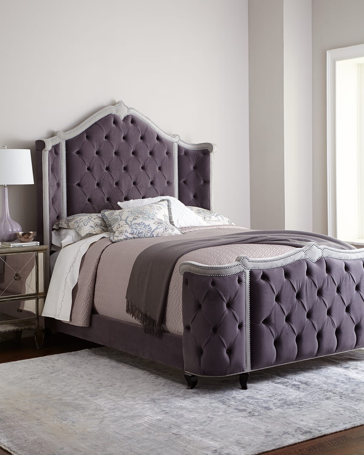 EXCLUSIVELY OURS. Handcrafted bed. Hardwood frame. Polyester velvet upholstery. 78"W x 93"L x 75"T. Made in the USA of imported materials. Boxed weight, approximately 269 lbs.