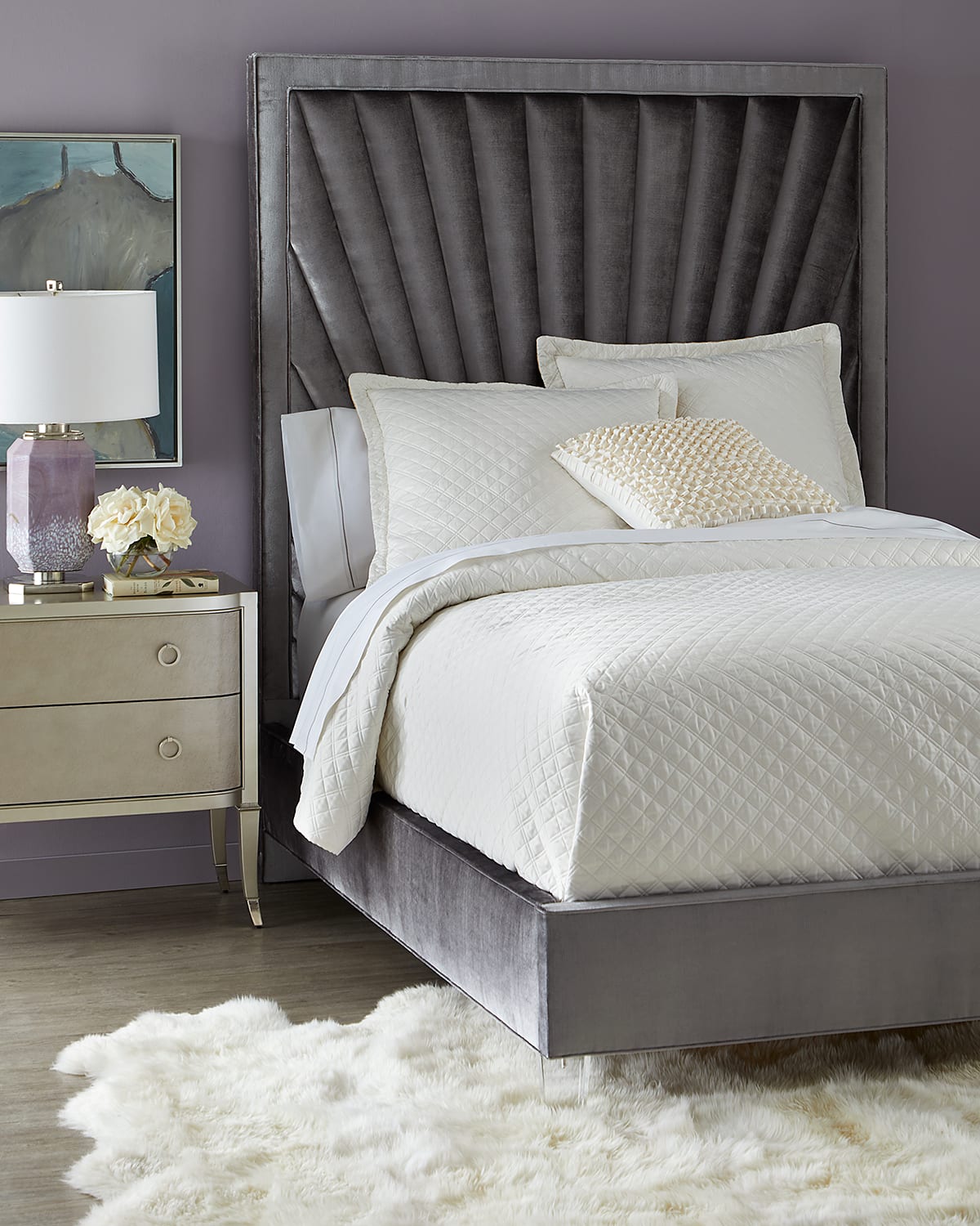 The Starla Bed features a starburst channeltufted headboard and acrylic legs Handcrafted of hardwood solids and acrylic Upholstery, velvet (polyester) Overall, approx. 66"W x 87"D x 79.5"T Inner, approx. 61.5"W x 81.5"D Rail height: 16" Slat height: 10.75" Space for box spring/mattress: 7.25" Assembly required; includes hardware Ships in multiple boxes Finished back Weight, 219.0 lbs Made in USA Total boxed weight, approximately 265.0 lbs