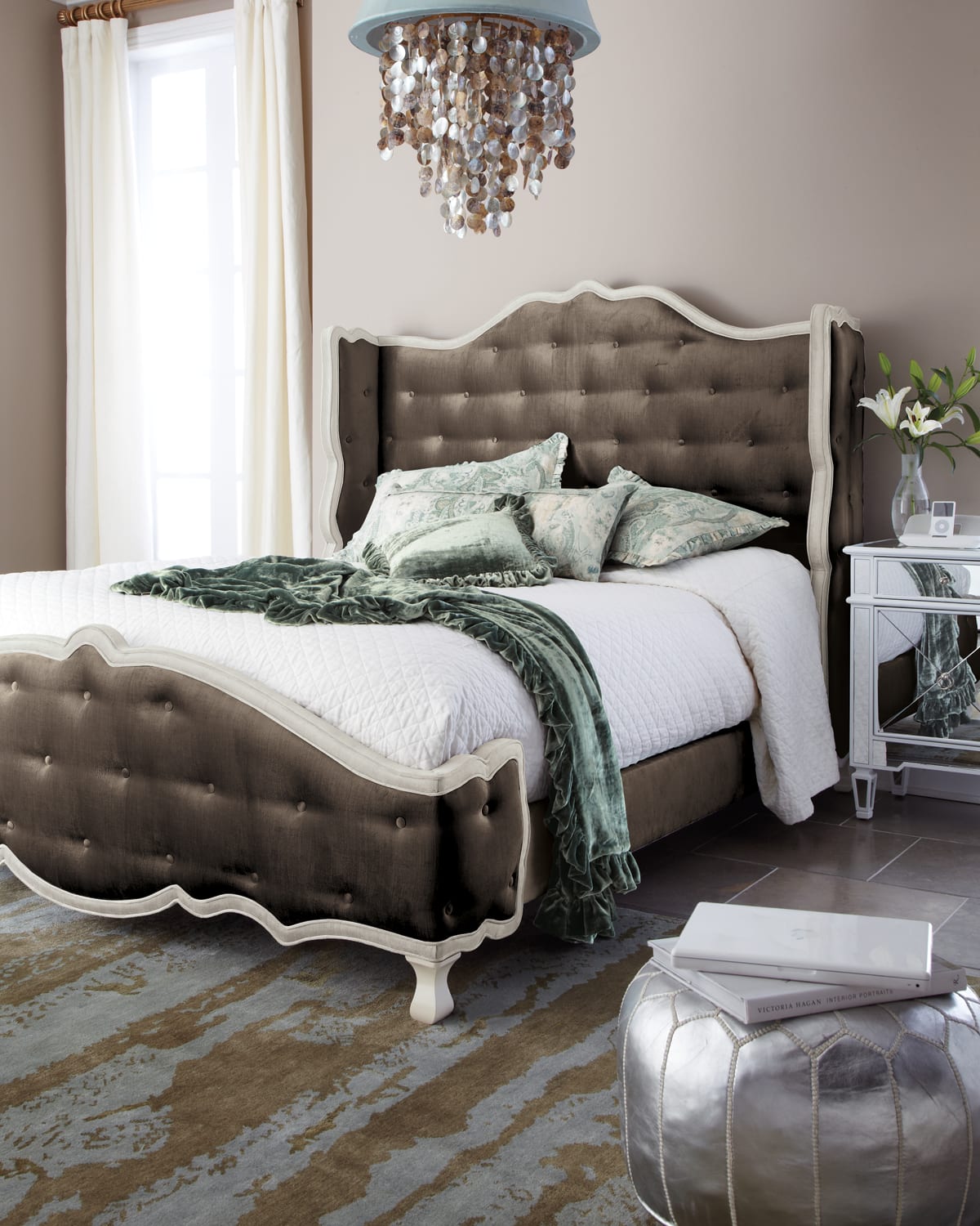 EXCLUSIVELY OURS. Hardwood frame. Buttontufting on brown velvetcovered headboard and footboard. Buttons and welt in dovewhite for contrast; legs have a creamy white finish. Headboard and footboard curve slightly at ends to embrace mattress. Headboards are all 61.75"T; footboards, 26"T. 84"W x 90"L; inner dimensions, 78.5"W x 88"L. Made in the USA.