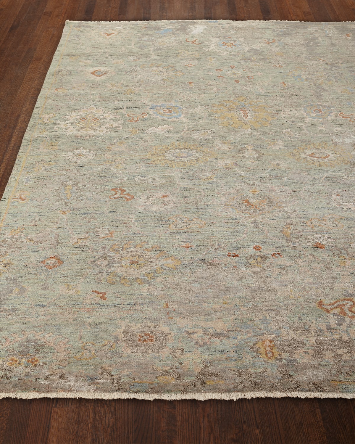 Handcrafted, transitional rug. HandKnotted using premium wool and Silkette™. Made by master artisans. Cotton foundation. All sizes approximate. We recommend use of a rug pad (not included). Imported.