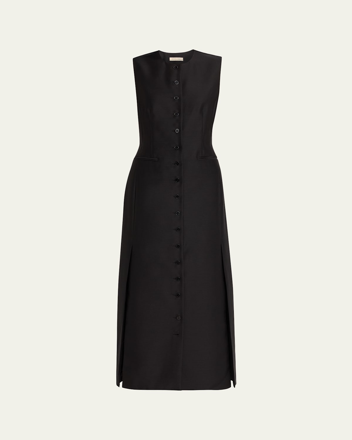 Heirlome "Paulina" dress is crafted of silkwool blend featuring tailored waist darts and back slits along the hem Approx. 54"L from shoulder to hem Round neckline; button front Sleeveless Hip welt pockets Sheath silhouette Ankle length Double walking vent back Button closure Silk/wool Made in USA from imported materials