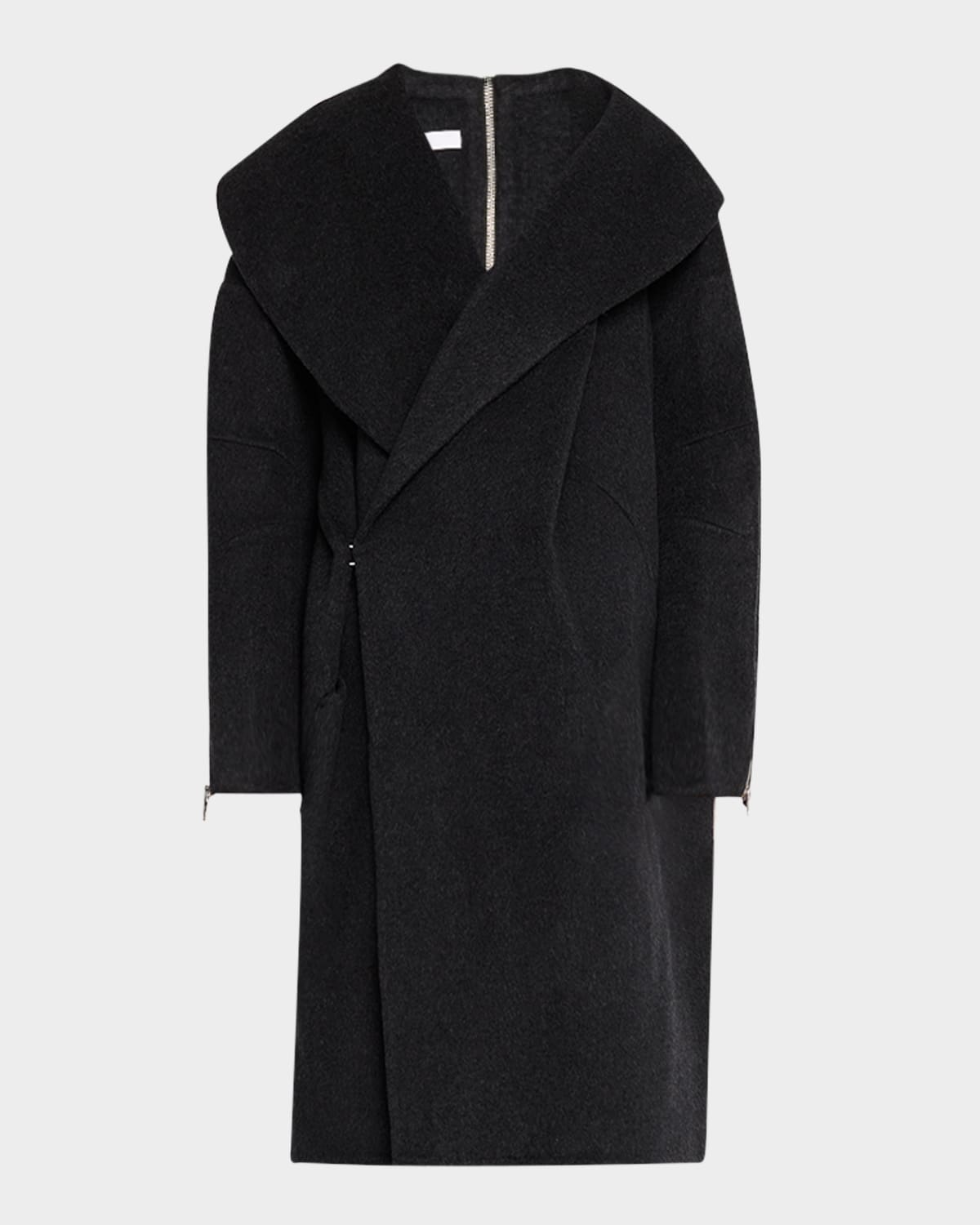 Helmut Lang cocoon jacket in solid wool Wide shawl collar with zip detail Dropped shoulders Long curved sleeves with zip cuffs Oversized fit Hem falls below the knee Openfront Wool Unlined Dry clean Imported