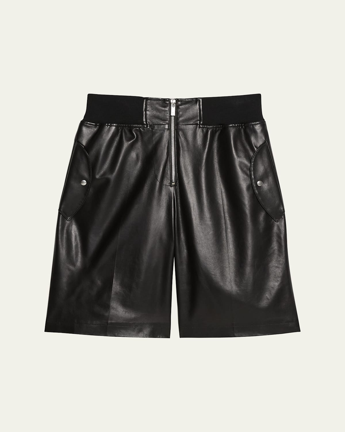 Helmut Lang bomberjacketinspired shorts in soft lambskin leather Approx. 11" rise; 9.5" inseam High rise Elastic waistband Side pockets with snaps; back welt pockets Relaxed fit Kneelength Exposed zipfront Leather Unlined Dry clean Imported