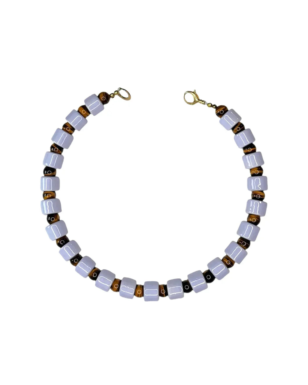 The Bloom and Tigers Eye Sundry Necklace by Her New Tribe is constructed from small ceramic short beads stacked with semi precious beads and finished with a raw brass closure. Each piece is formed, fired, and assembled by hand in Austin, Texas. Features a pale purple gloss and classic tigers eye. Approximately 18" long. Small batch and very limited