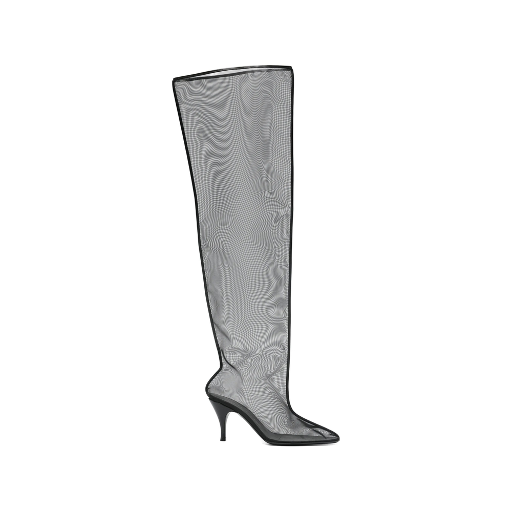 black mesh overlay pointed toe stiletto heel pull-on style above-knee height This piece comes complete with a protective dust bag.