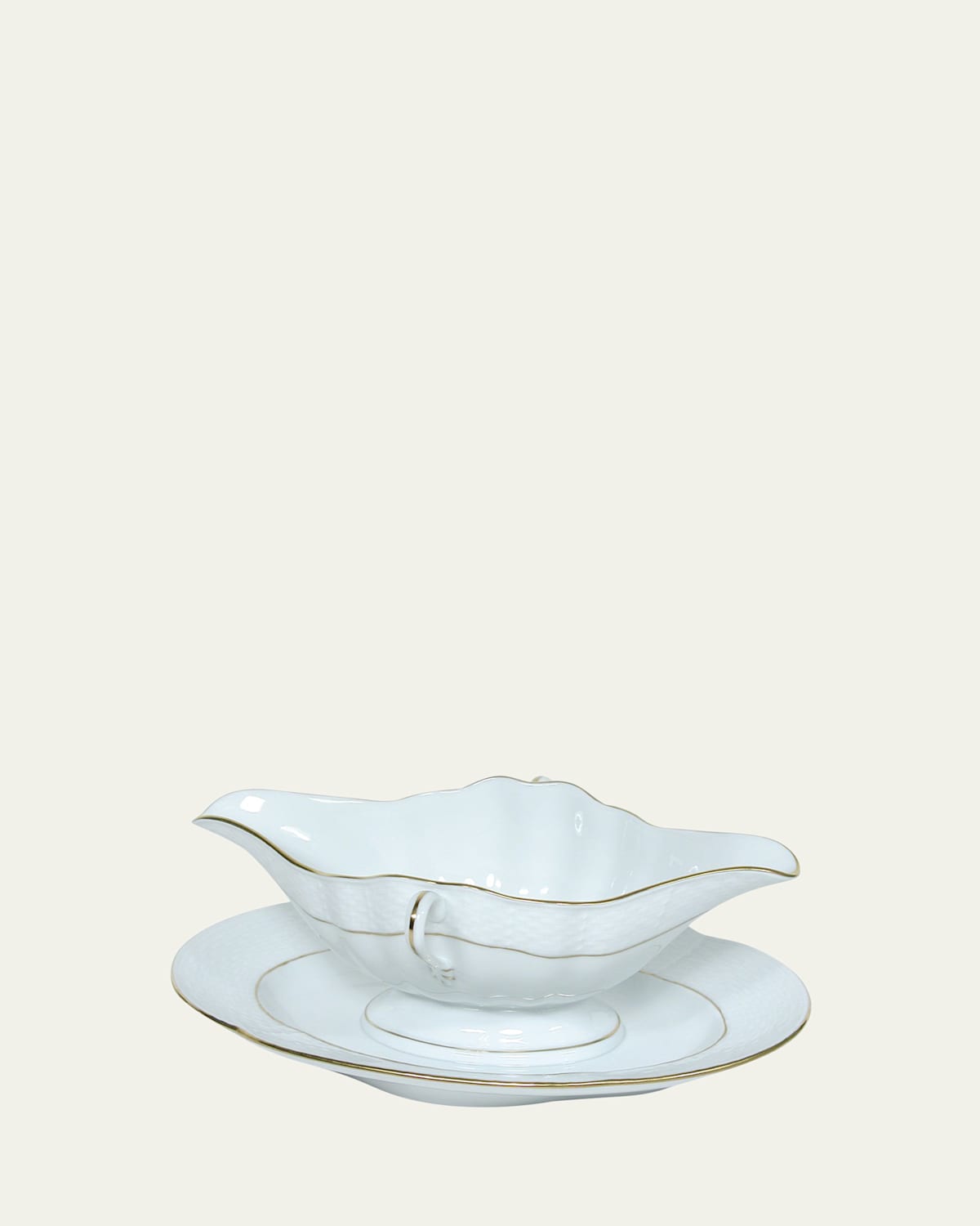 Timeless simplicity with a golden touch.• White porcelain. • Golden inner and outer border; irregular scalloped edge. • Basketweave textured rim. • Oblong shape.• Made in