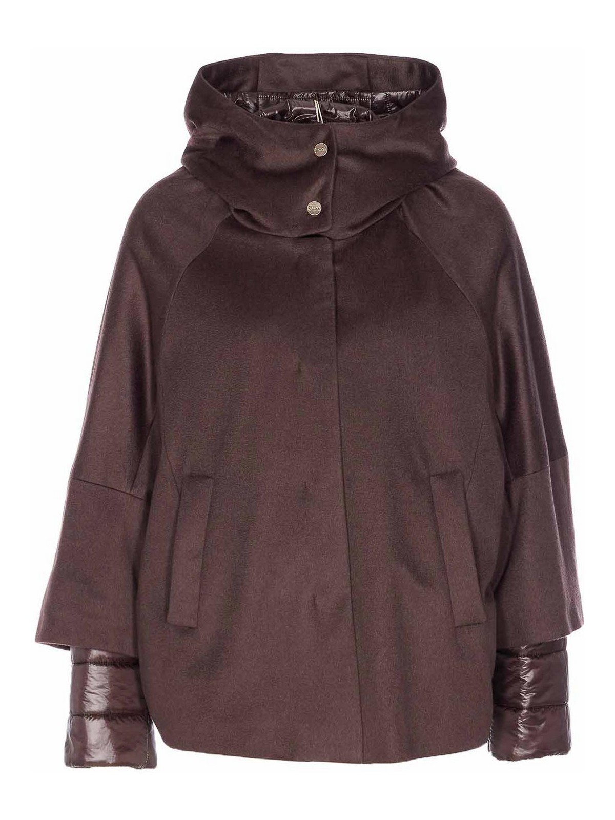 Veste Herno marron avec boutons frontaux, capuche, manches longues, poches amovibles sur les manches. Nom de la couleur du créateur: marron