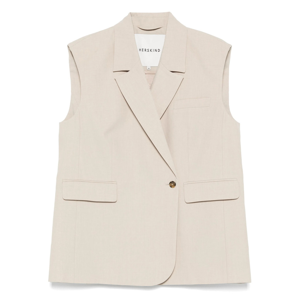 light beige double-breasted button fastening two side flap pockets English rear vents shoulder pads