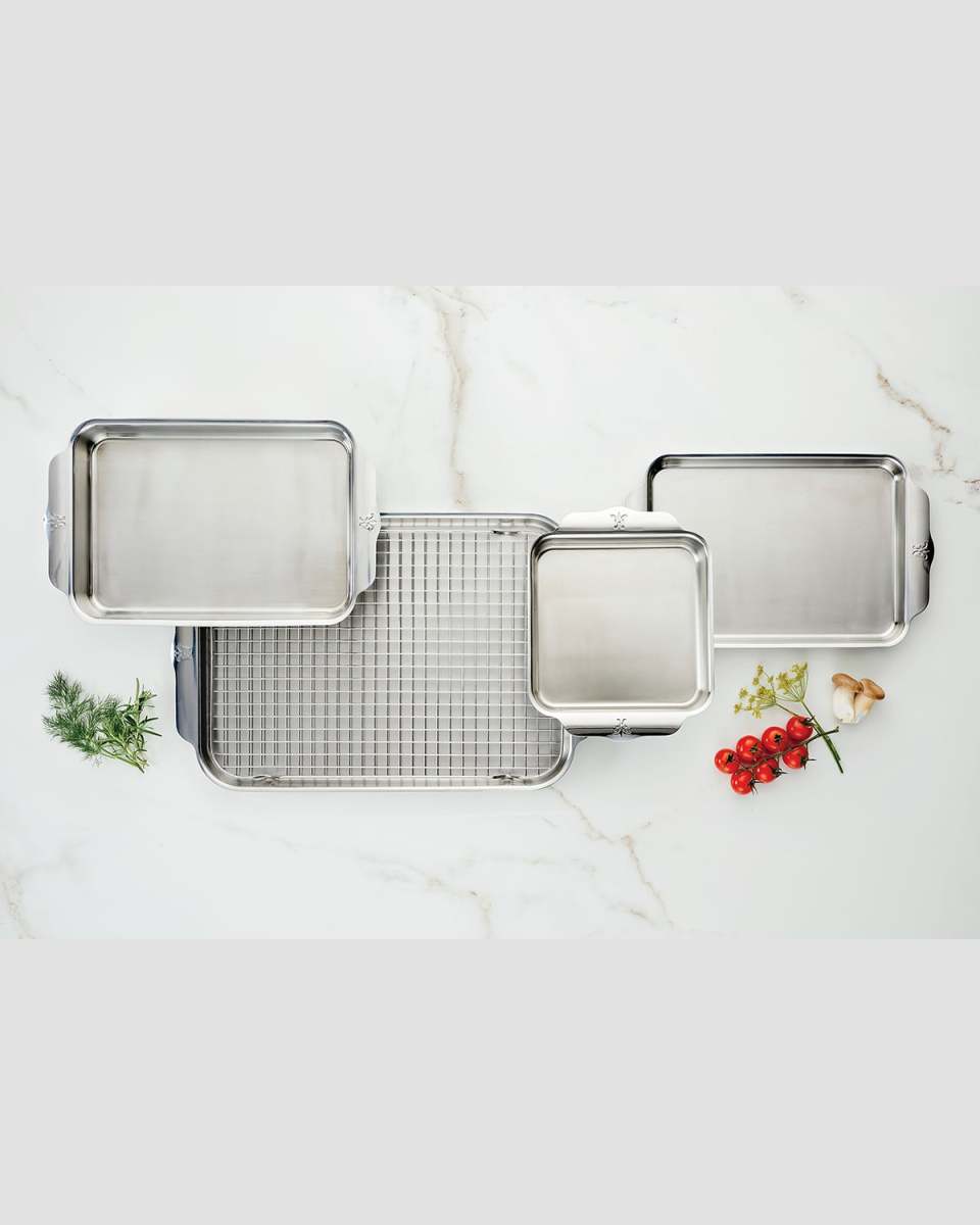 This complete set is the perfect choice to outfit your kitchen for years of baking and ovenroasting. Perfect for holiday entertaining. Set includes a Half Sheet Pan (13" x 18"), Quarter Sheet Pan (9" x 12"), stainless steel rack (12.2" x 17.5"), Square Baker (8"Sq.), and Rectangular Baker (9" x 13") Triply clad stainless steel with a responsive aluminum core Wide, curved handles on pans for extra comfort and support Oven and broiler safe to 600°F Half sheet pan designed to fit 30" ovens Warpresistant Item Weight (Lbs.): 13.5 Hand wash Made in Italy