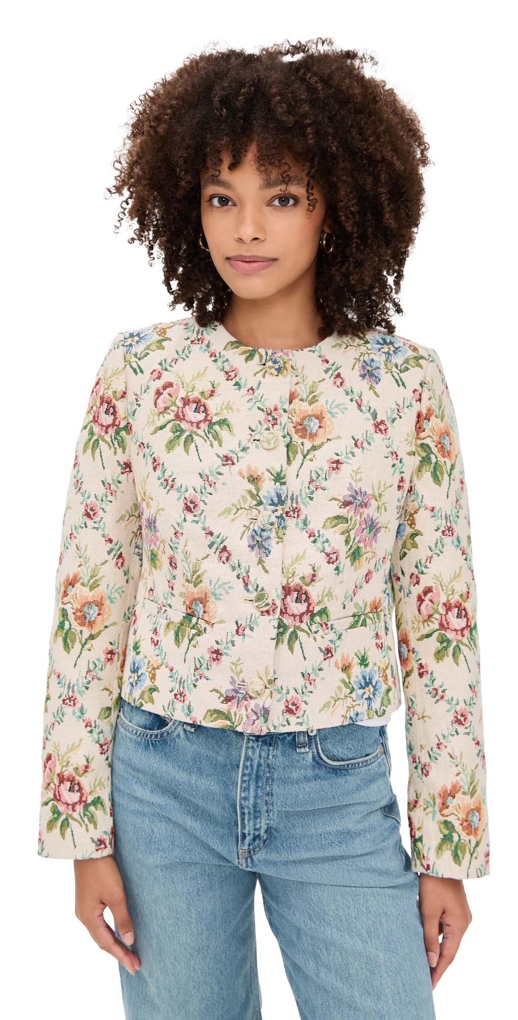 Fabric: Mid-weight, non-stretch weave. Padded shoulders. Floral pattern. Crew neck. Long sleeves. Button placket. Faux welt back pockets. Shell: 65% polyester/35% cotton. Lined. Lining: 100% polyester. Dry clean. Imported, Vietnam. Measurements: Measurements from size S Length: 19.25in / 49.0cm, from shoulder