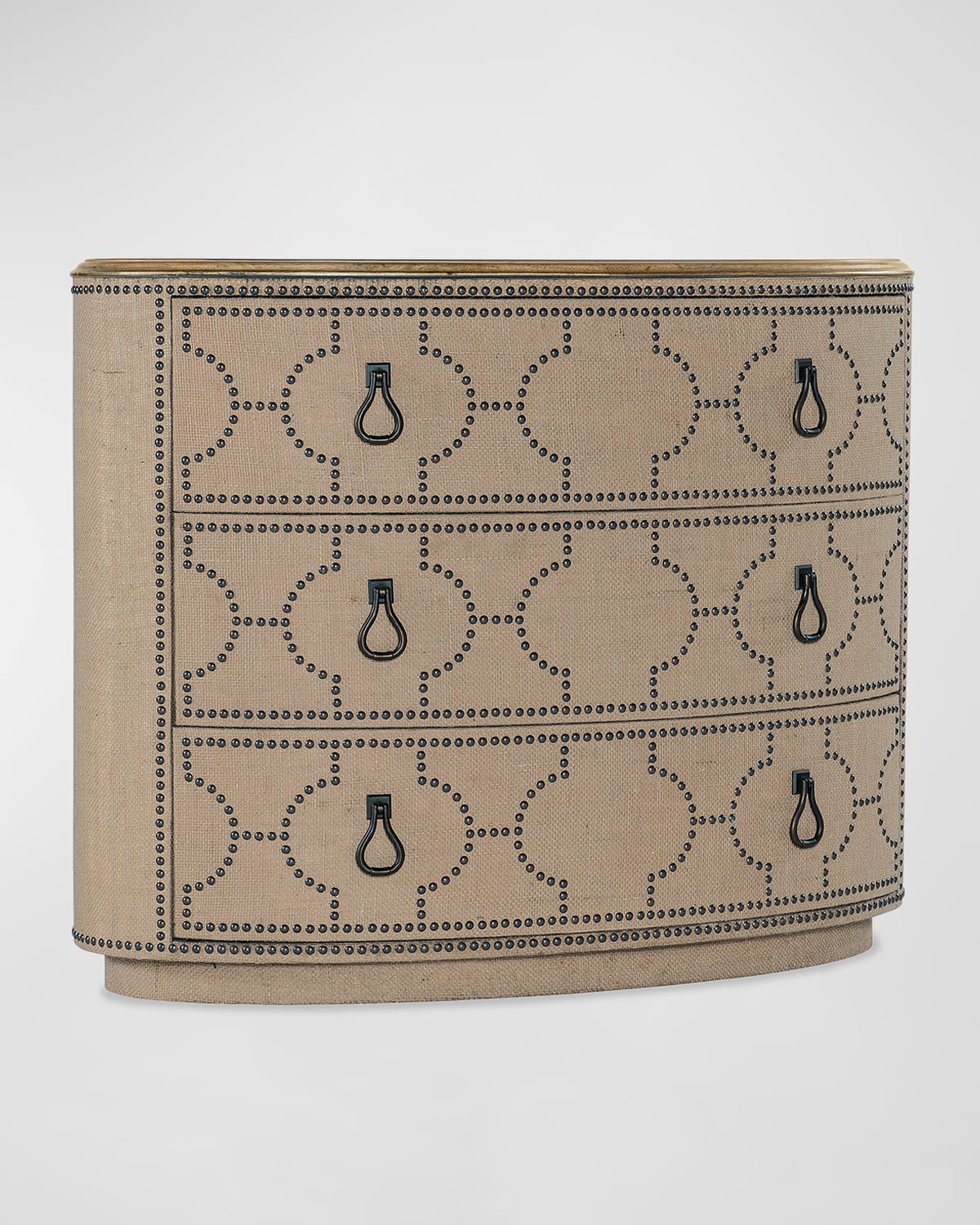 Vintageinspired and tactile with a chic flair, the Big Sky ThreeDrawer Chest combines a pecky hickory veneer solidwoodedged top in a vintaged natural finish revealing the authentic knots and wood grain with a burlapwrapped case accented by a patterned nailhead design. With three selfclosing drawers, the top drawer has a removable felt liner and the bottom drawer is cedarlined. The burlap is a natural material and slight color variation from piece to piece can be expected. Overall, approx. 38"W x 20"D x 30.3"T Includes hardware Finished Back Imported Weight, 122.0lbs Boxed weight, approximately 144.3lbs